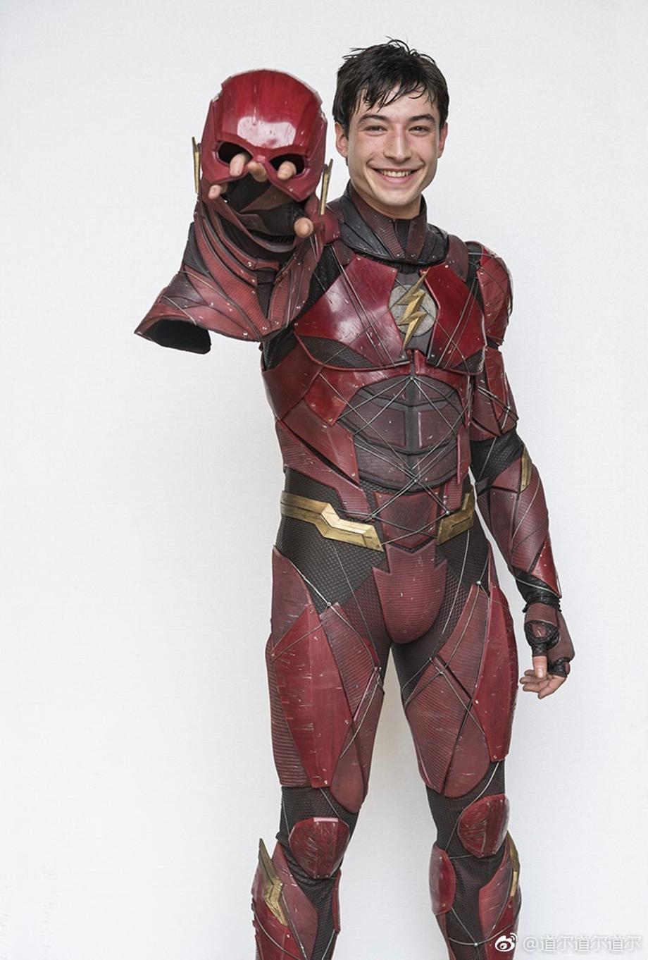 An unused publicity shot of Ezra Miller having some fun with his Flash costume.