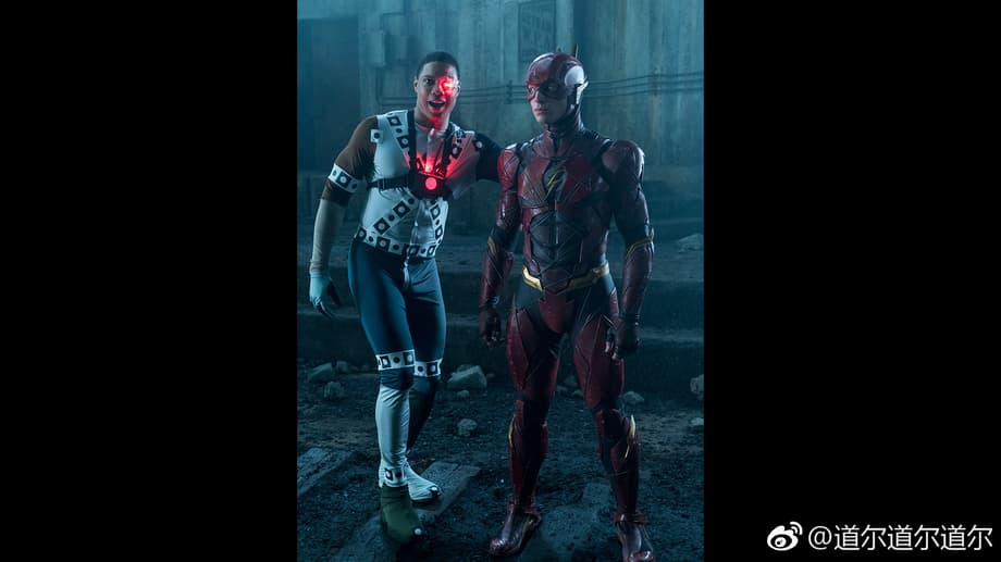 Cyborg (Ray Stevens) and The Flash (Ezra Miller) clowning around between takes.