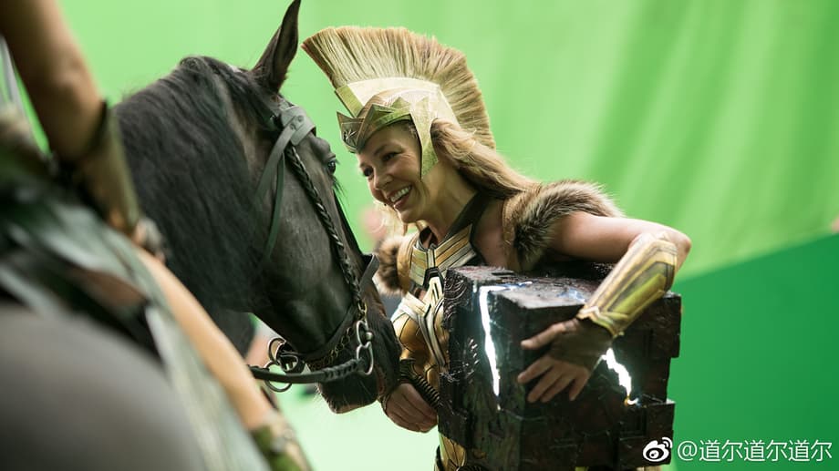 A BTS shot of Connie Nielsen (Queen Hippolyta) and her equine pal.