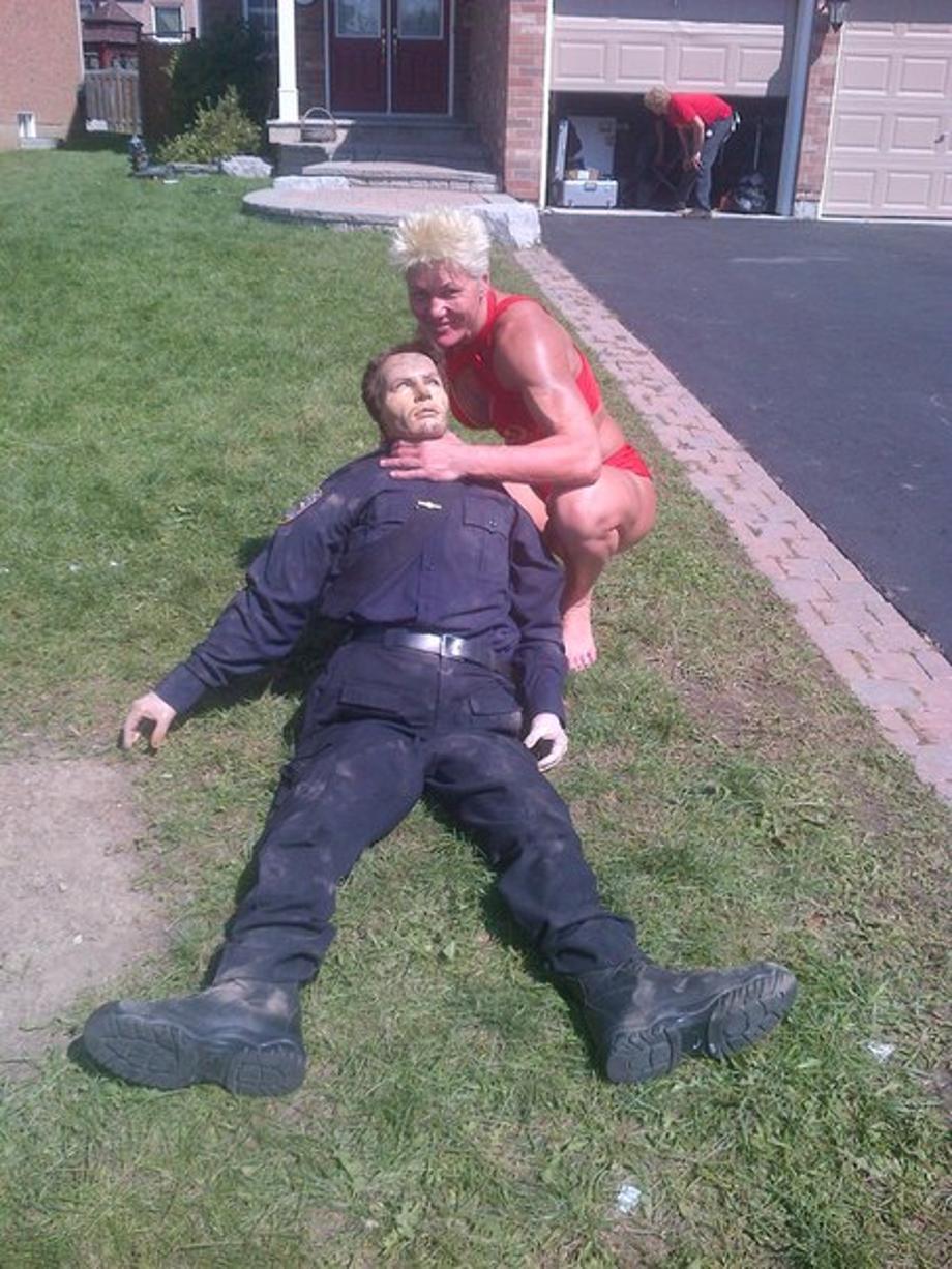 Also behind-the-scenes pics of actor/comedian John Leguizamo, who plays Javier, standing next to Mother Russia, Olga Kurkulina. The second image is of Olga in her costume choking a dummy cop and was taken a few weeks ago, but has just popped online recently.