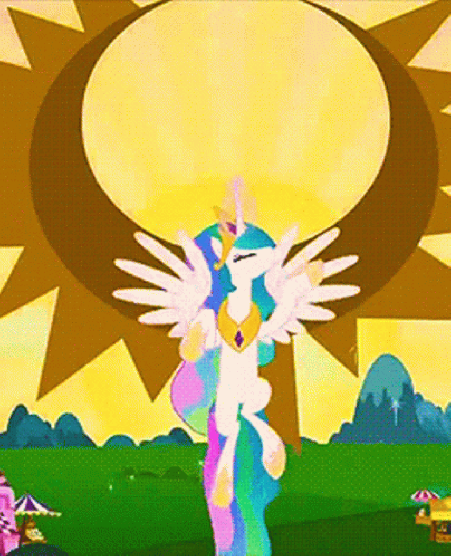 Princess Celestia is one of the main characters in the My Little Pony franchise, particularly in the "Friendship is Magic" series. She is an alicorn (a winged unicorn) with a white coat and a multicolored mane and tail. Her cutie mark is a sun with rays.
