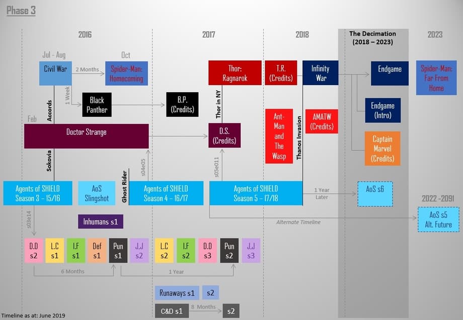 With the end of Phase 3 shortly upon us in the form of ‘Spider-Man Far From Home’, now is as good a time as any to assess the current state of the Marvel Cinematic Universe timeline before Phase 4 arrives. The three infographics below represent a comprehensive attempt at piecing together every bit of information offered by the movies, TV shows, short films (and occasionally tie-in comic books) into a single coherent timeline.