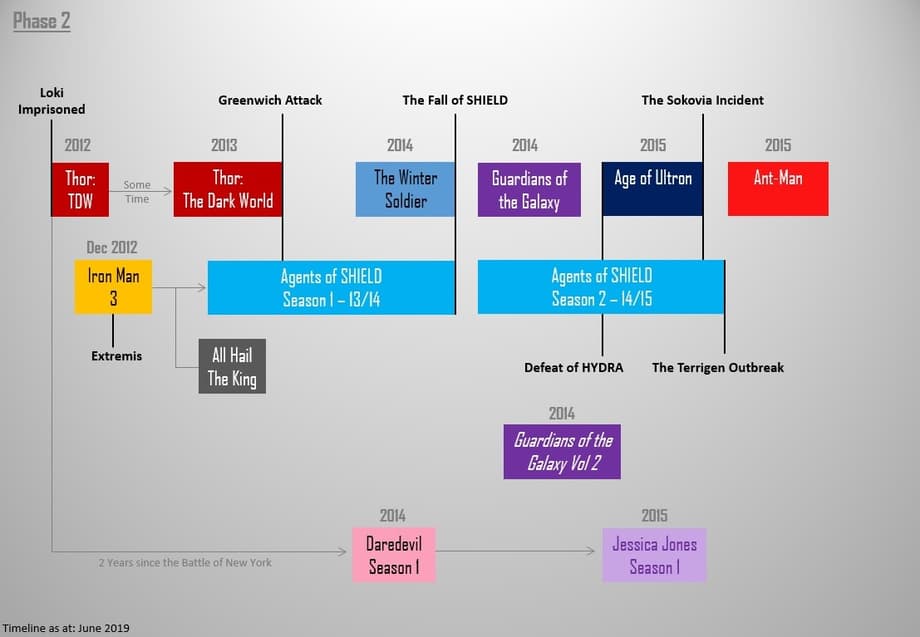 The Phase 2 timeline was probably the easiest to put together, as all of the movies are broadly set in the same order as they were released, and the early seasons of Agents of SHIELD provide nice anchor points for most of the key events. Overall this probably represents the most inter-connected era that Marvel TV and Marvel Movies have yet managed.