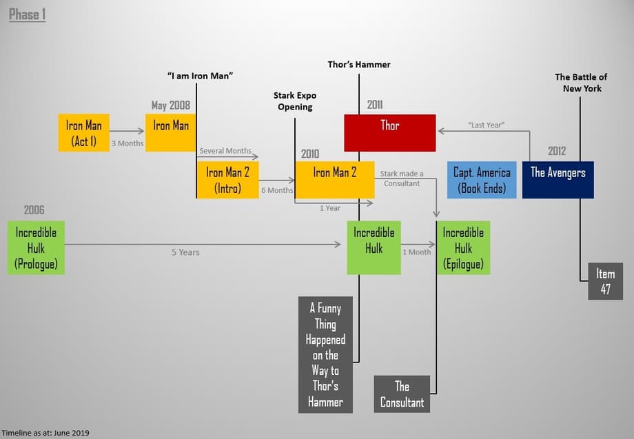 That said, piecing it all together is one of the things that makes the MCU so fun, and no doubt many of you will have your own interpretations as to the correct order of things, or have differing opinions as to what counts as “canon” or not, but below I present for your consideration my current MCU Timeline in the form of three infographics for each phase, as well as a bonus slide for major events that occurred pre-Phase 1.