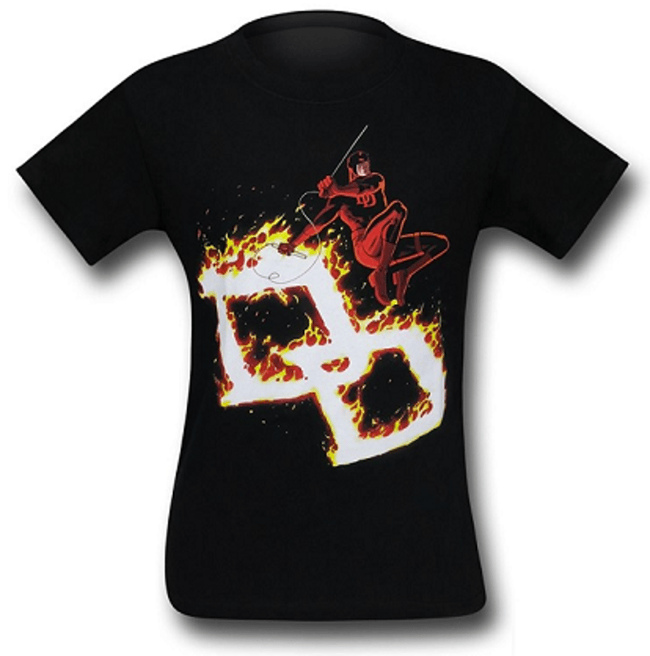 The Man Without Fear soars above his immolated logo on the 100% cotton Daredevil Firebrand Logo Black T-Shirt! Do you guys think it takes some extra work for Matt Murdock to create his logo or does his extra senses help him lay down perfect Roman alphabet letters like one of those compass things for drawing perfect circles? He probably just has somebody else show up and draw them ahead of time for him...he is a lawyer after all! He probably pays them in the Daredevil Firebrand Logo Black T-Shirt. Yeah.
