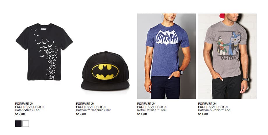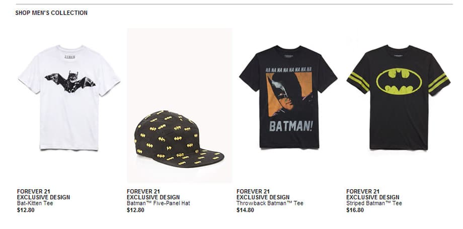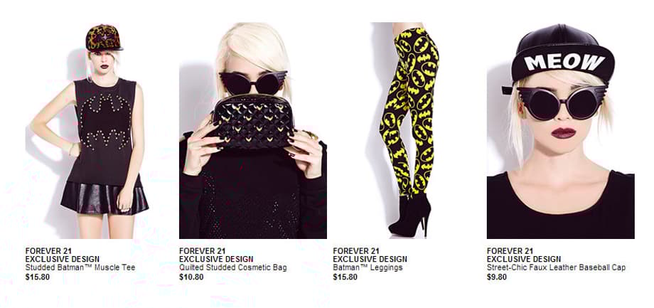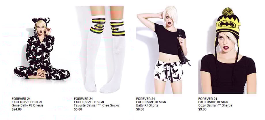 “We’re excited to partner with Forever 21 for the Bats & Cats collection to bring the iconic characters of Batman and Catwoman to the closets of fashionable fans in a fun and feisty way,” said Karen McTier, Executive Vice President, Domestic Licensing and Worldwide Marketing, Warner Bros. Consumer Products. “From the comic panels to the catwalk, this collection is sure to drive fans batty.”