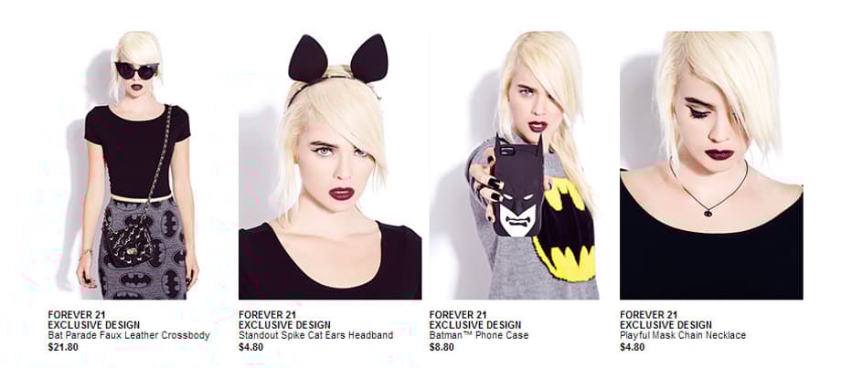 “We have been enthralled with the animal emergence and took to cats, epitomizing a soft femininity and bats, symbolizing our desire for nocturnal nonconformity for an updated approach to the trend,” said Betsy Zanjani, Forever 21 SVP of Product Design. “This limited-edition line will allow our customers to discover unique and contemporary merchandise with a nostalgic charm of bats, cats and the iconic Super Heroes of Gotham City.”