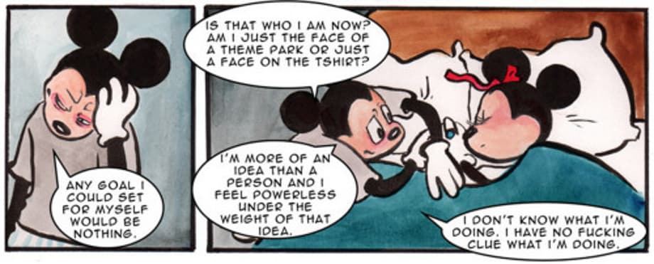 But then Ashley, a "webquaintance" of mine who'd done one or two other fun collabs with, just volunteered to do it. I can't possibly emphasize enough how much her art added to it. She did the panel layouts, everything. There was something about it. The inherent energy, still touched by those somber watercolors. It really touched me. I'm thrilled that it's been so well received, but I don't know if I'm going back to Mickey any time soon.