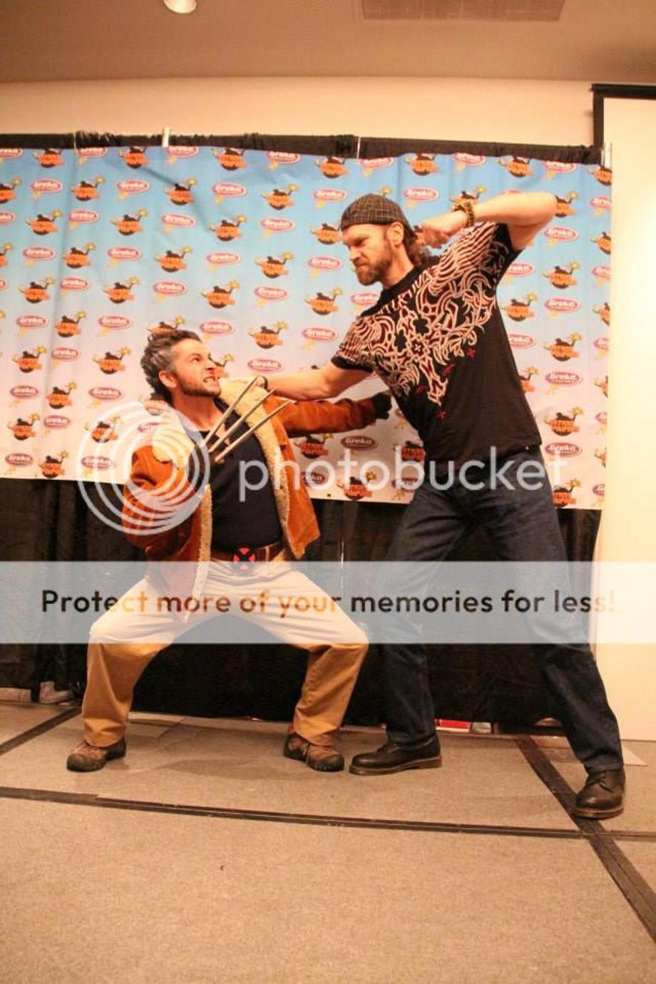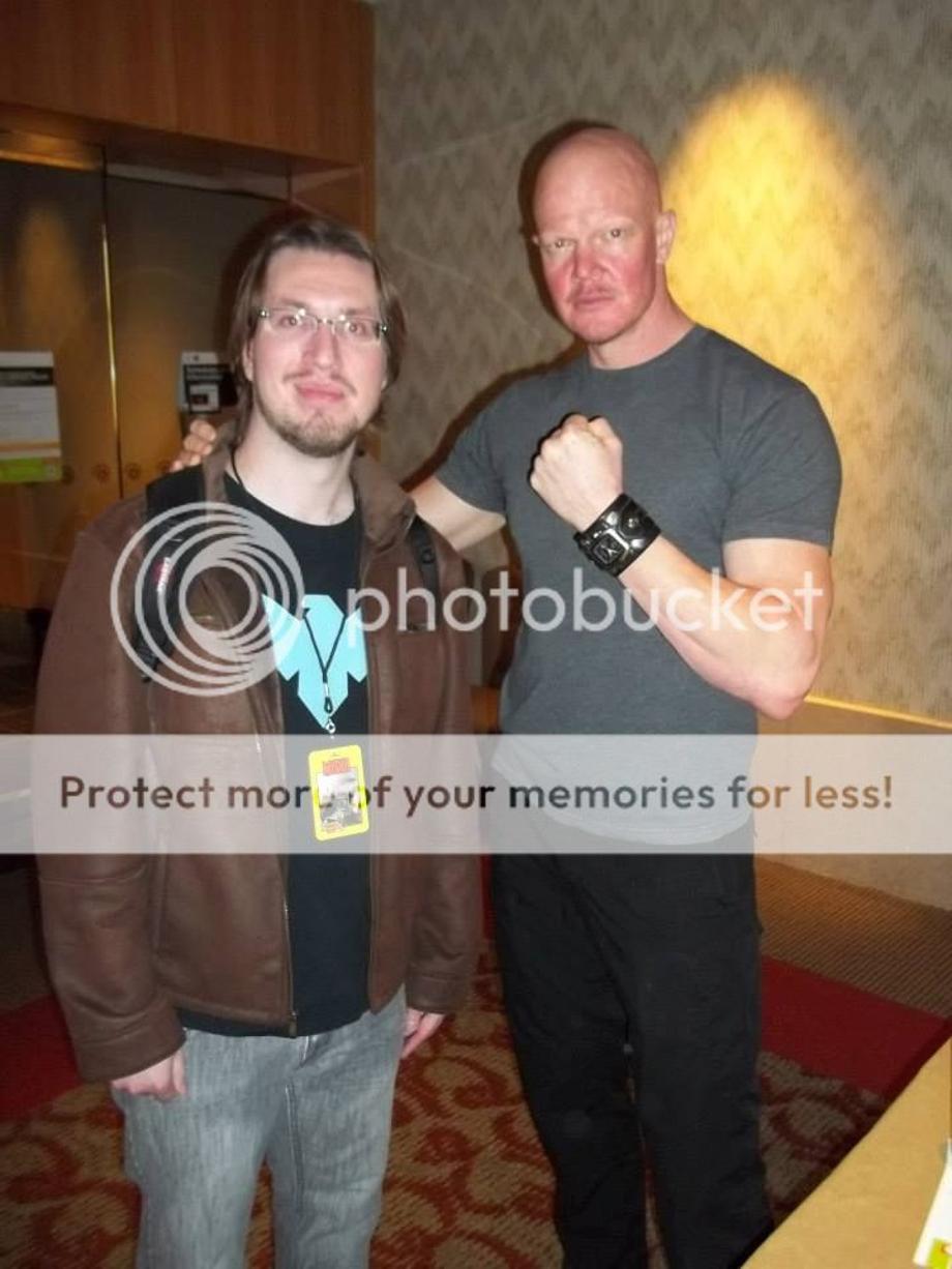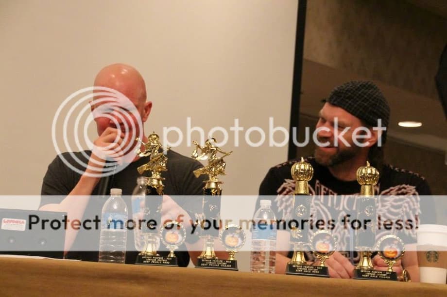 After the costume contest, I took a short break and treated myself to a rock hard bagel. It was then time to get back to business/ pleasure and meet the celebrities. Being an enormous fan of superhero animation, it was an honor to meet John DiMaggio and Hynden Walch. I even got to hear them do their respective Aquaman and Harley Quinn voices! And let me tell you, for guys that have played some of the most iconic killers in cinema, you would be hard pressed to find two guys nicer than Tyler Mane and Derek Mears. Mears, having played Jason in Friday The 13th (2009) and the eponymous creature in Predators, was really cool and a huge comic book geek. You also no doubt remember Mane as Sabretooth in X-Men and Michael Myers in Rob Zombie's recent Halloween films. Both men were also there to promote their new film Compound Fracture and are open to reprising their aforementioned iconic roles. Mane is willing to don the Shatner mask and jumpsuit again if "the script is good and they don't send Michael Myers into space."