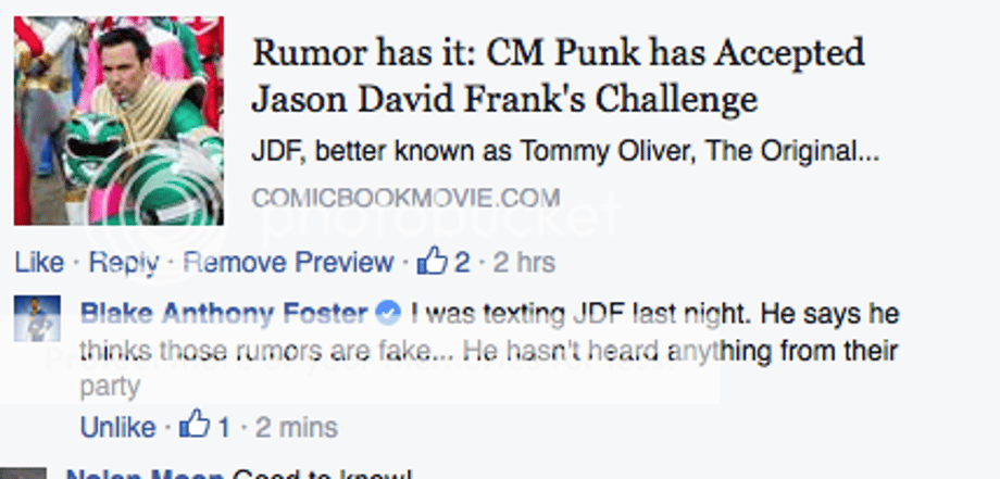 So a long time ago Jason David Frank (41). Better Known as Tommy, The origial Green Power Ranger from Mighty Morphin Power Rangers (Who has also been the White, Red Zeo, Red Turbo and Black Dino Thunder Power Ranger.) He has been trying to fight WWE star CM Punk (36) for a while.