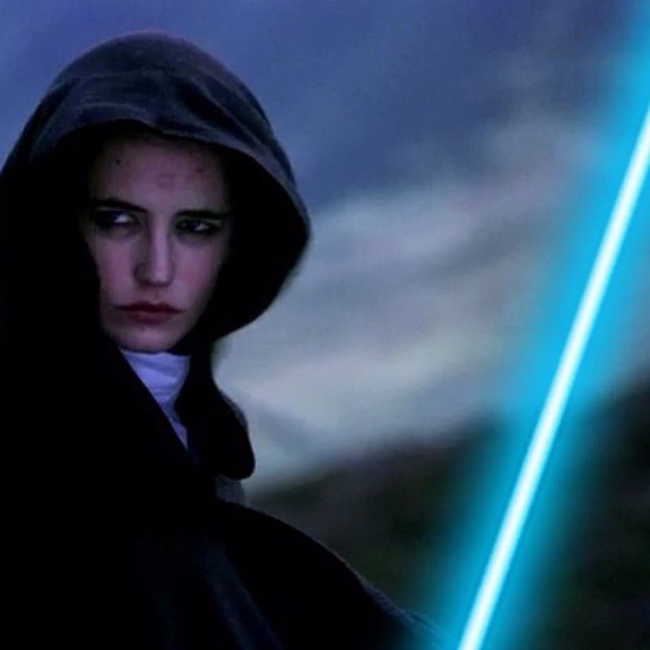 Plus how ambitious would it be to finally make a female a Sith Lord in the movies? Females in general don't get too many lead roles in action moives so each time one does it's a step-up. Who better than Eva Green to give us the first female sith. The picture above, switch the blue lightsaber with a red one and behold...we have our Darth Eva.