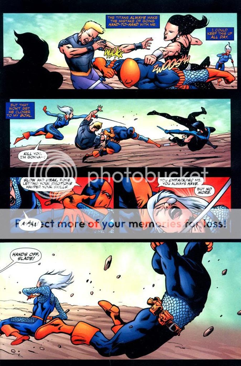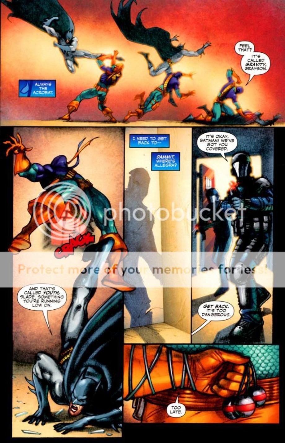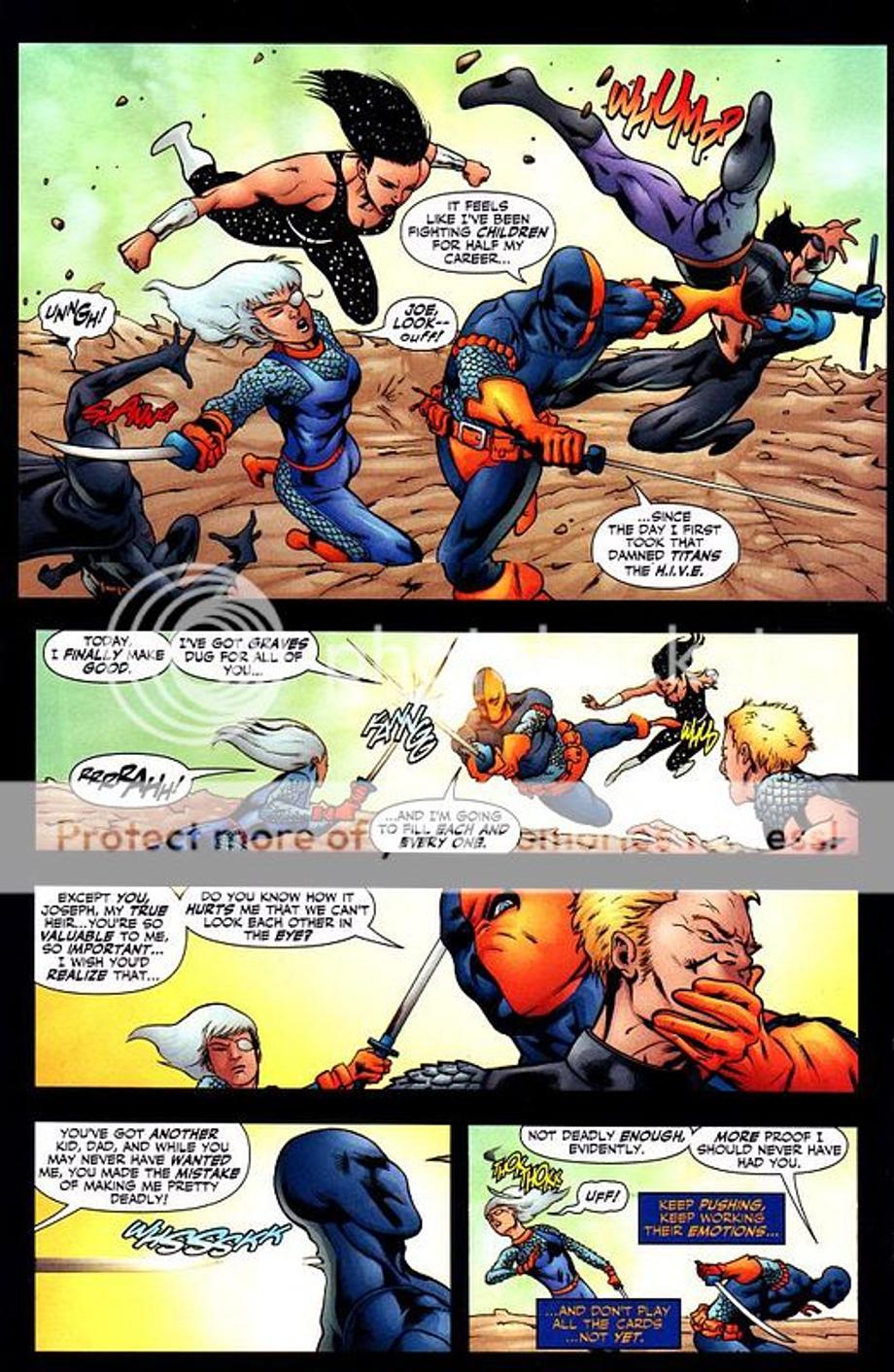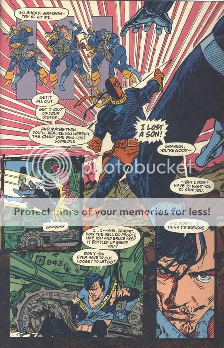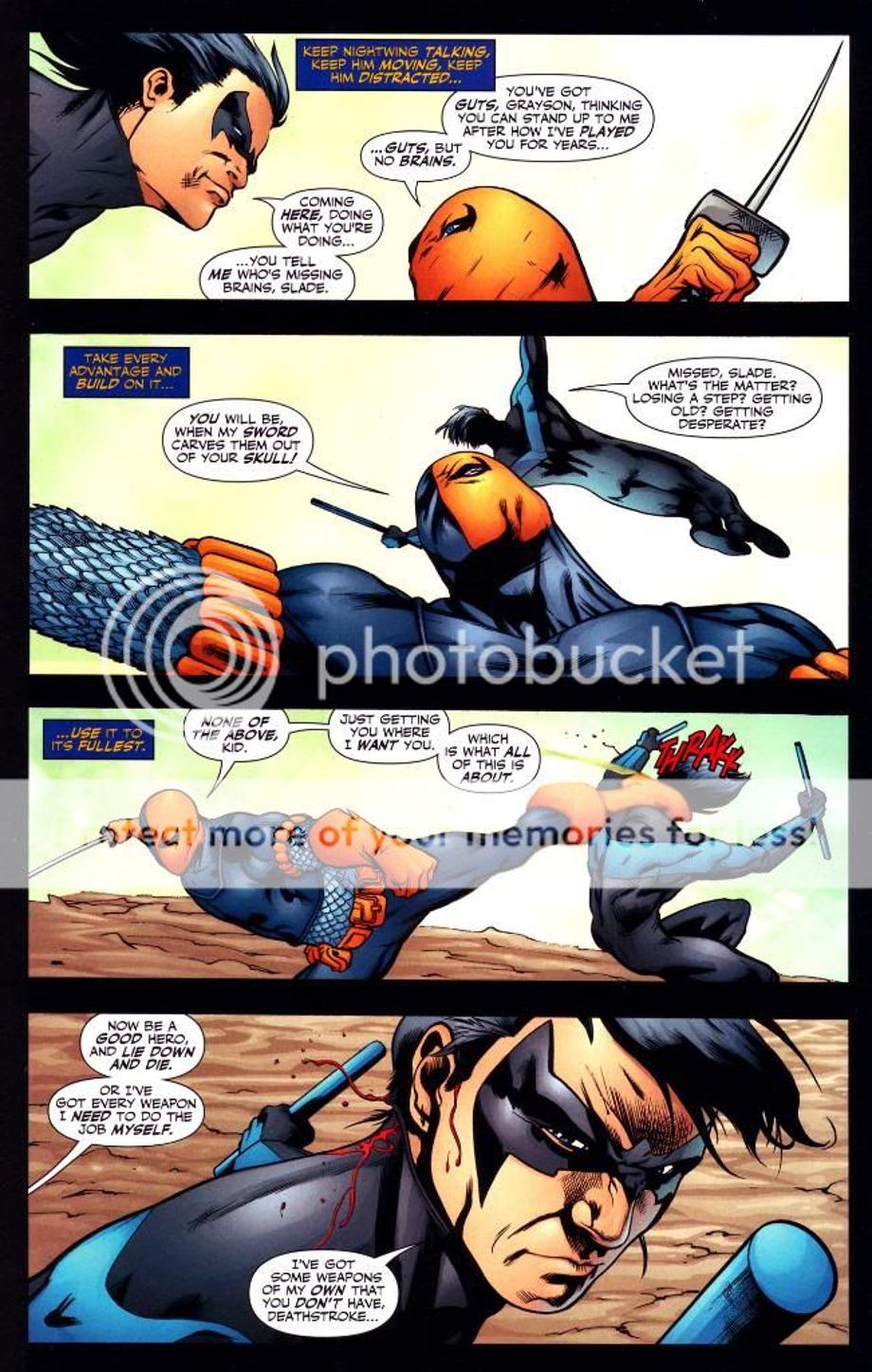 10. Nightwing is enraged over Slade killing his son, and Slade is suprisely lenient and tame.......still though, he easily takes all Nightwing's blows (letting him hit him), and floors him with a backhand. Then he makes sure he's alright.