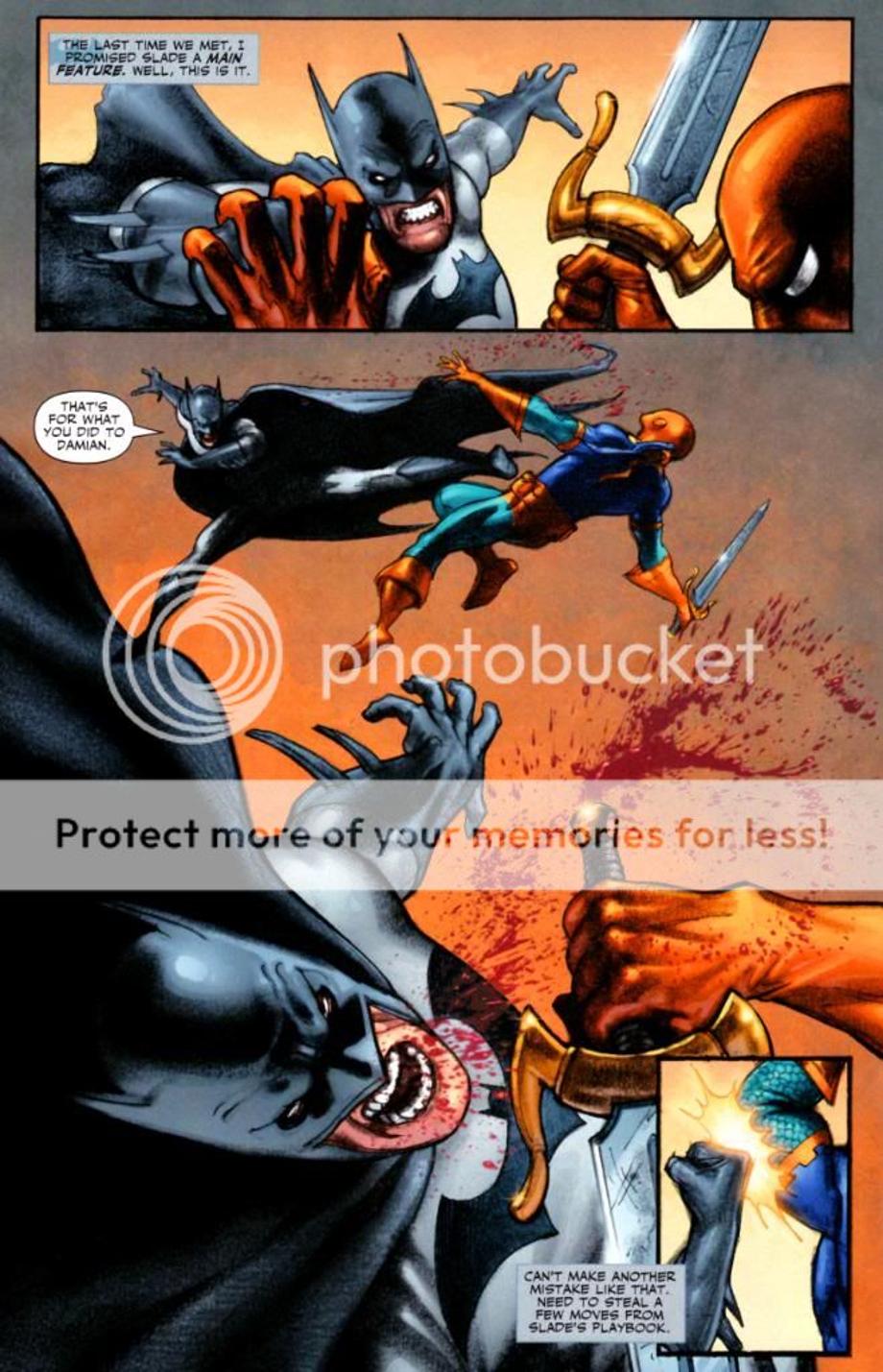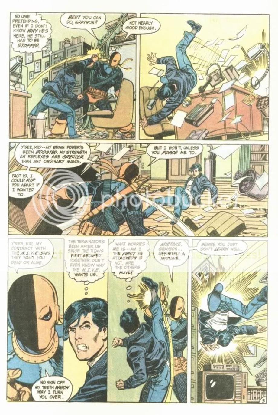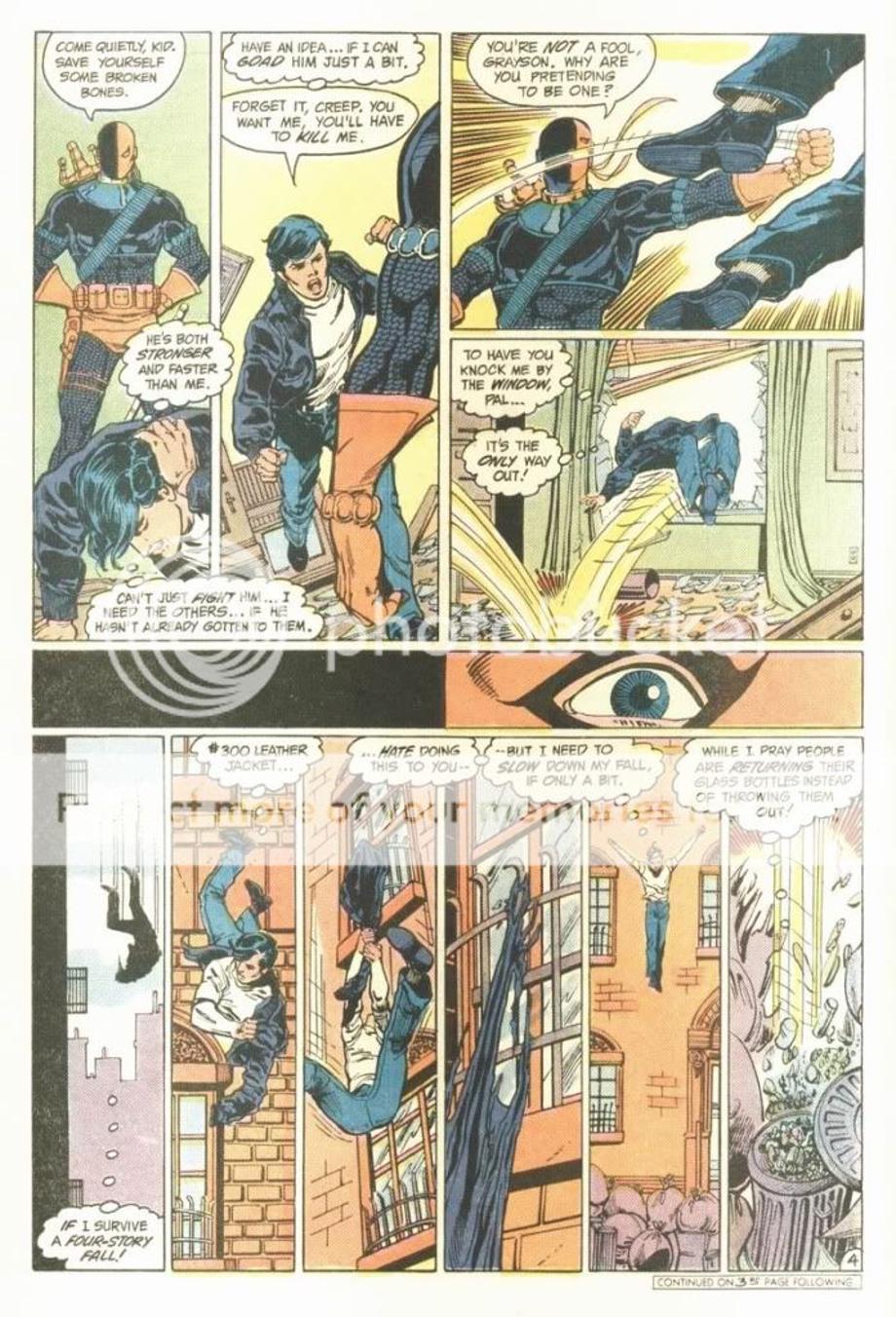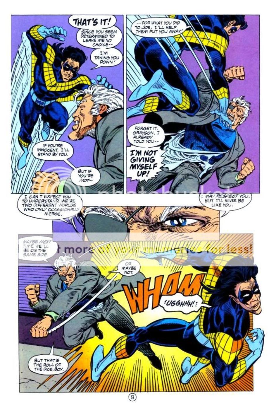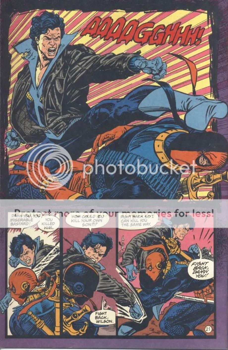 10. Nightwing is enraged over Slade killing his son, and Slade is suprisely lenient and tame.......still though, he easily takes all Nightwing's blows (letting him hit him), and floors him with a backhand. Then he makes sure he's alright.