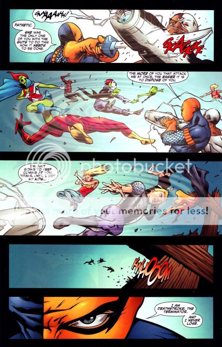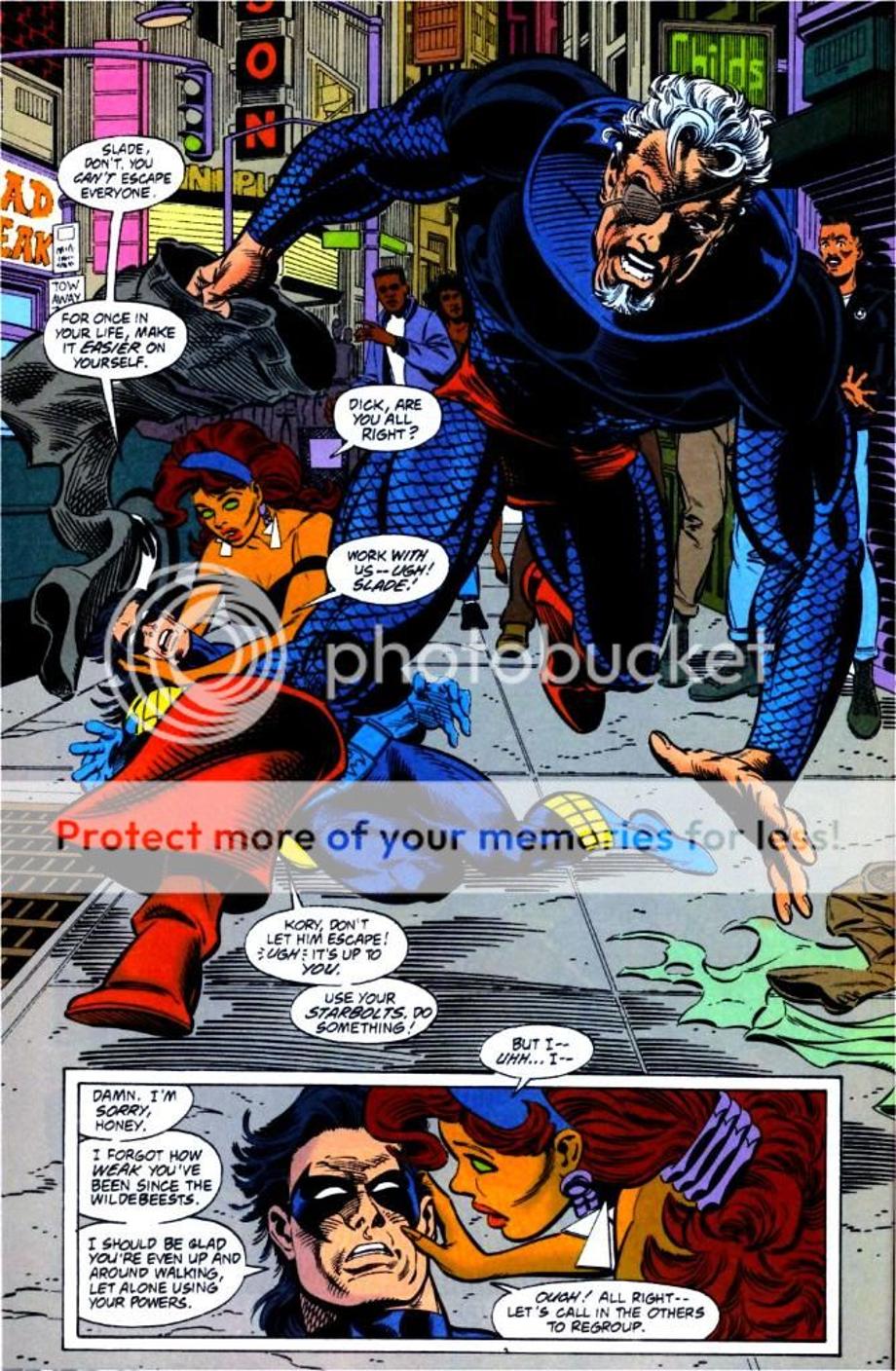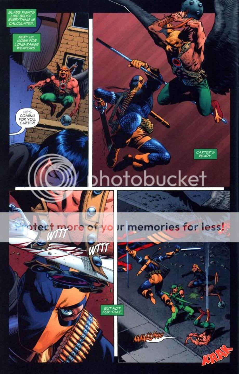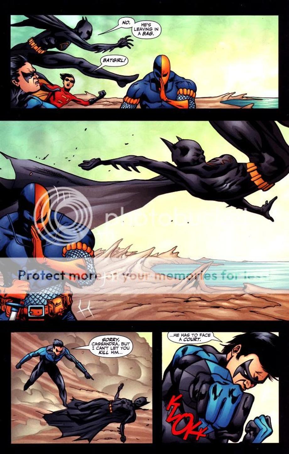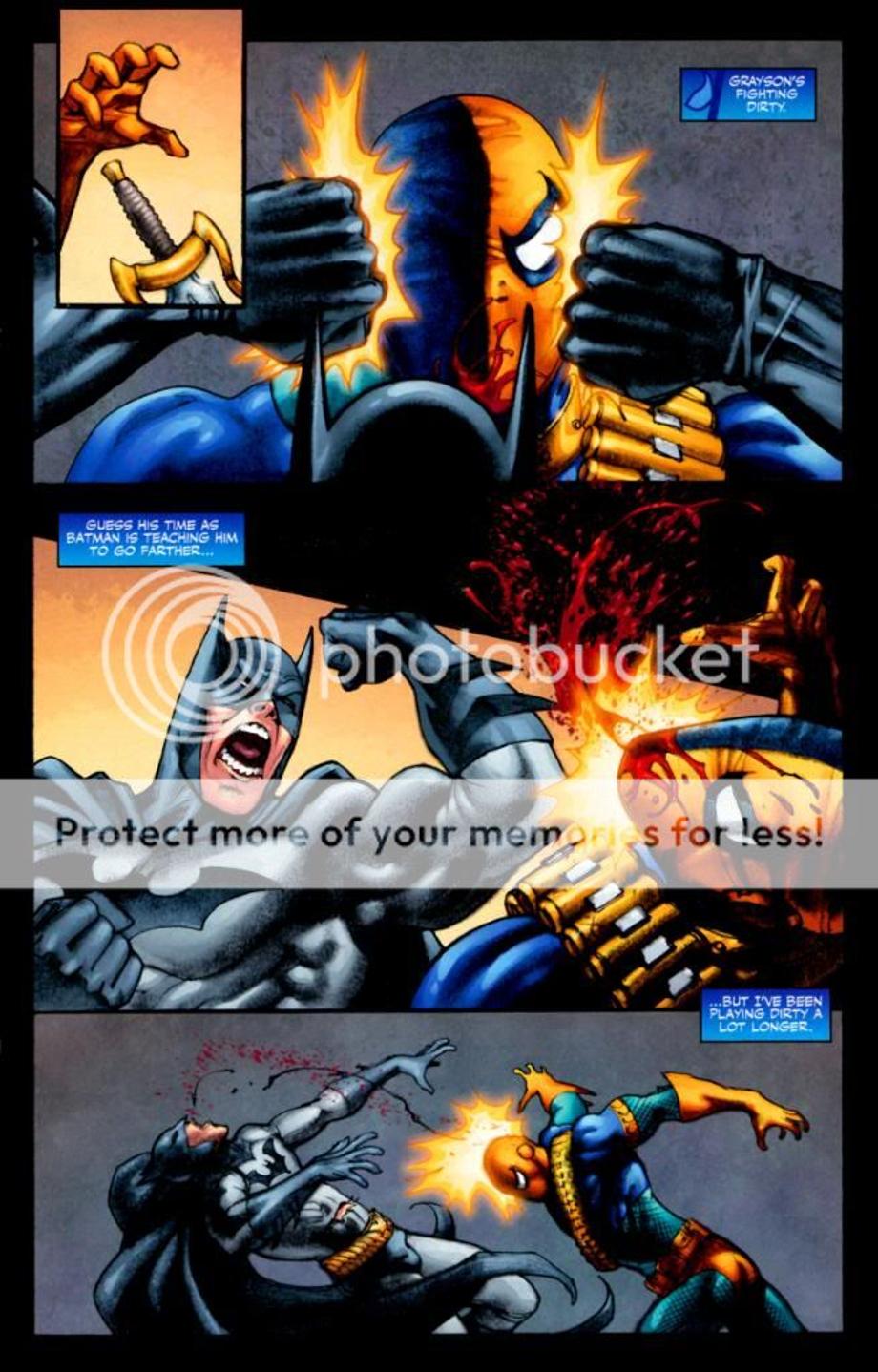10. Nightwing is enraged over Slade killing his son, and Slade is suprisely lenient and tame.......still though, he easily takes all Nightwing's blows (letting him hit him), and floors him with a backhand. Then he makes sure he's alright.