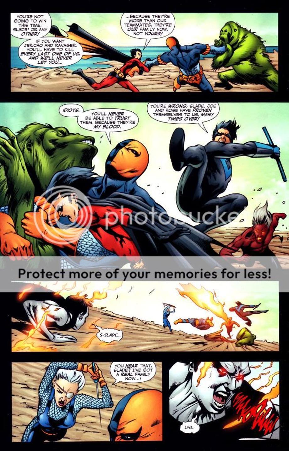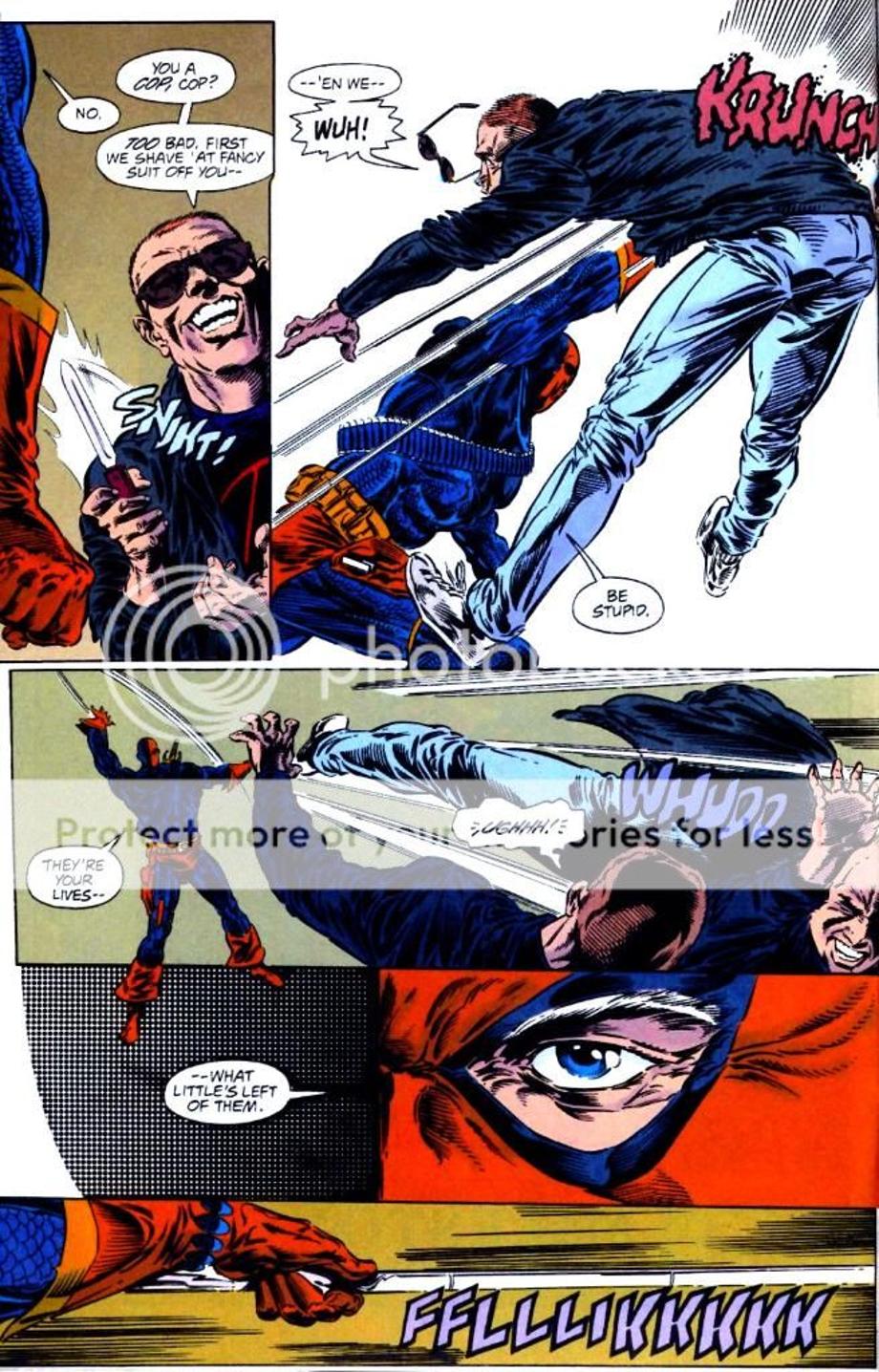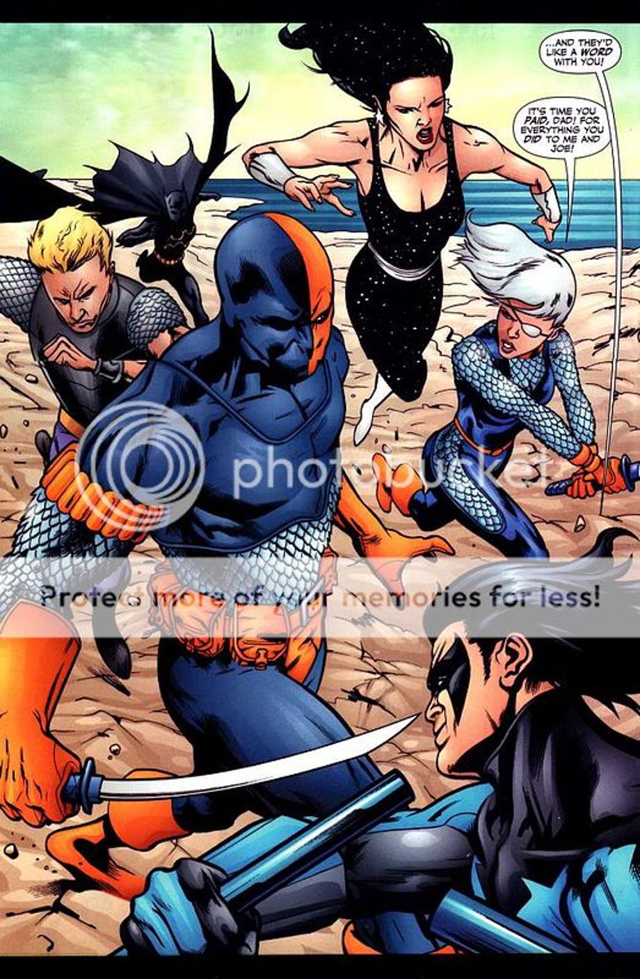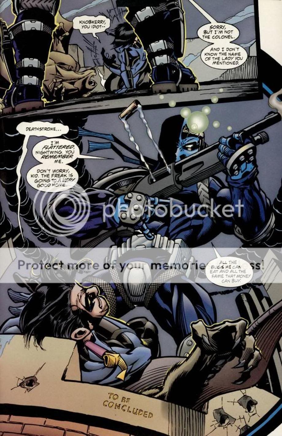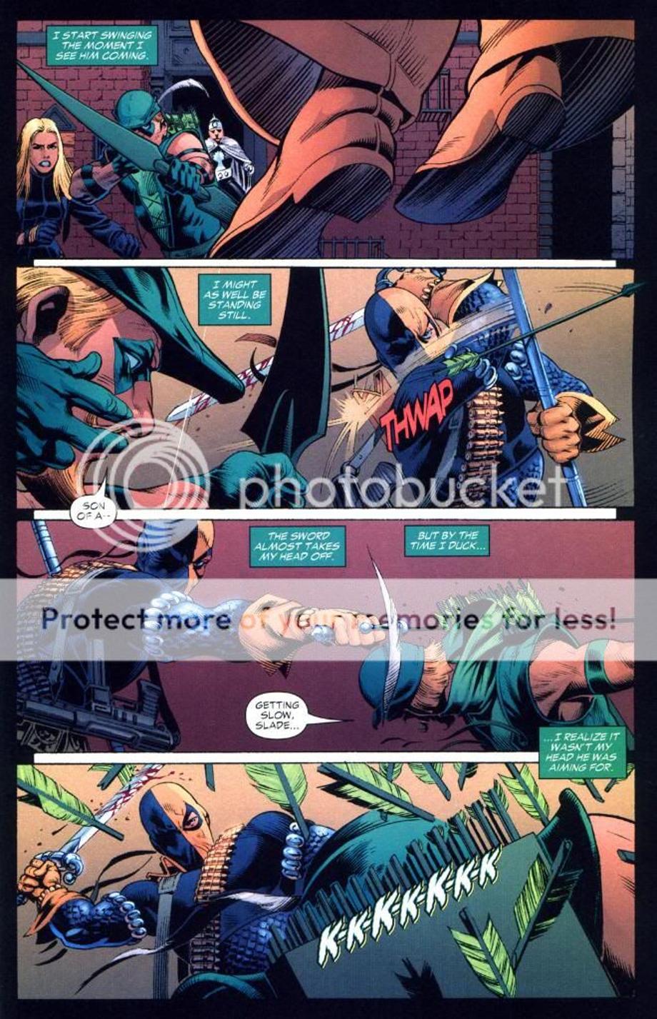 10. Nightwing is enraged over Slade killing his son, and Slade is suprisely lenient and tame.......still though, he easily takes all Nightwing's blows (letting him hit him), and floors him with a backhand. Then he makes sure he's alright.