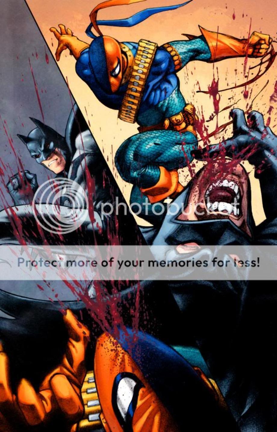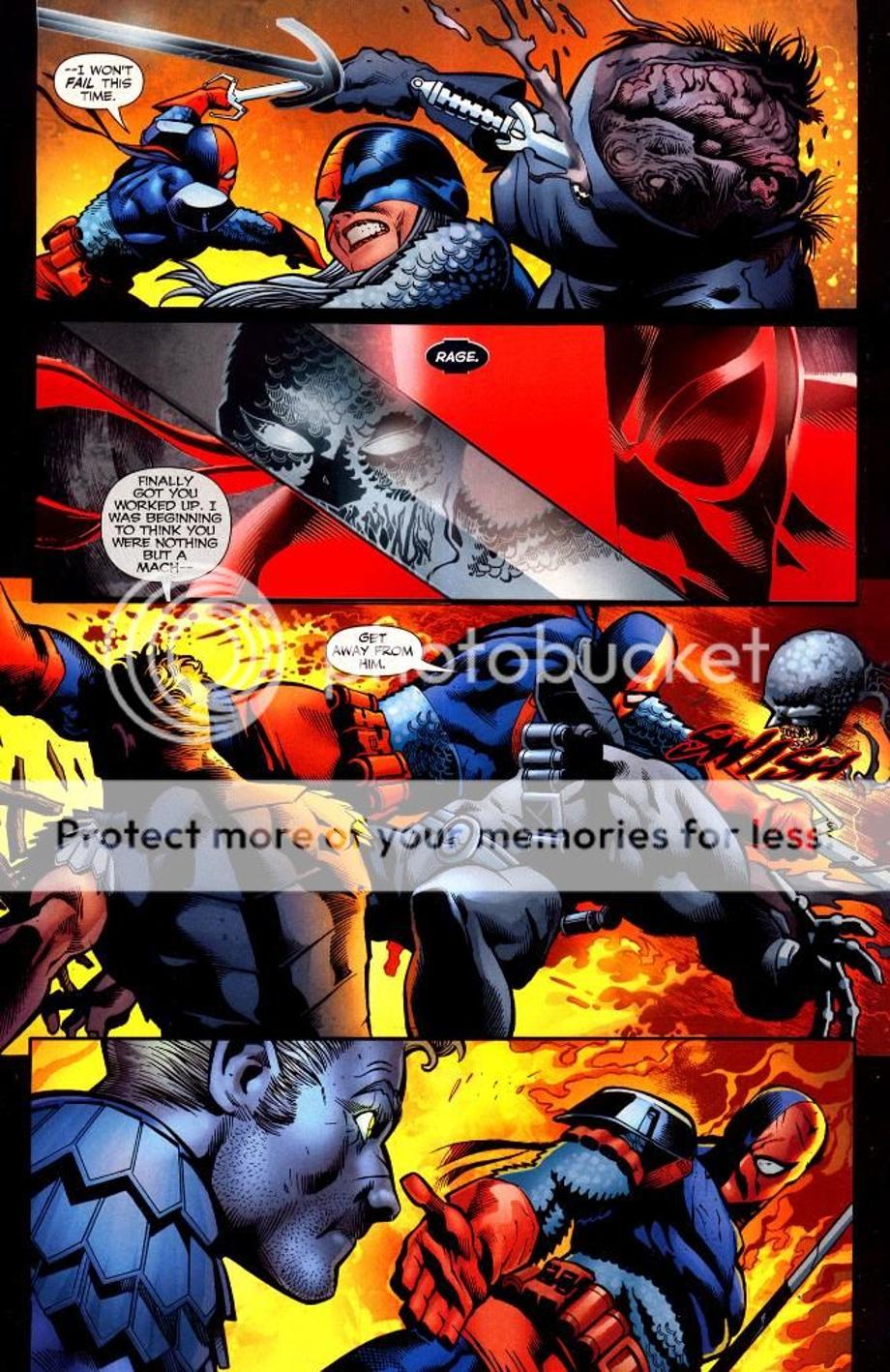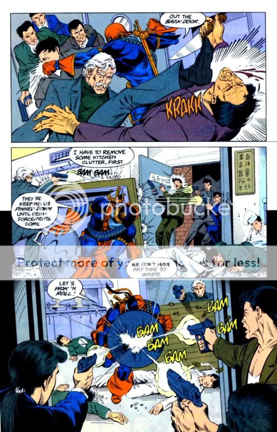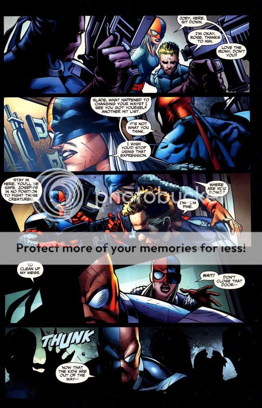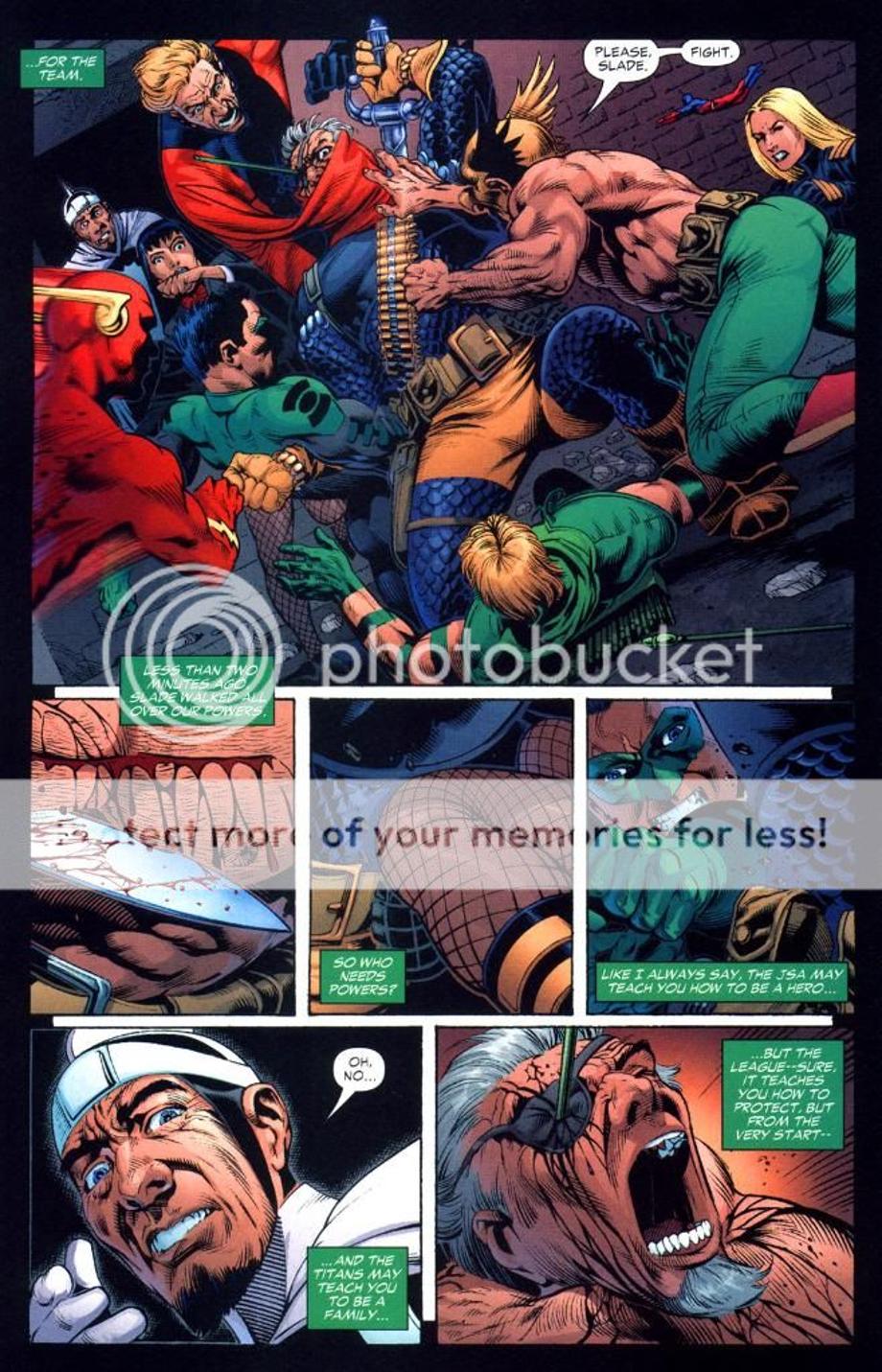 10. Nightwing is enraged over Slade killing his son, and Slade is suprisely lenient and tame.......still though, he easily takes all Nightwing's blows (letting him hit him), and floors him with a backhand. Then he makes sure he's alright.