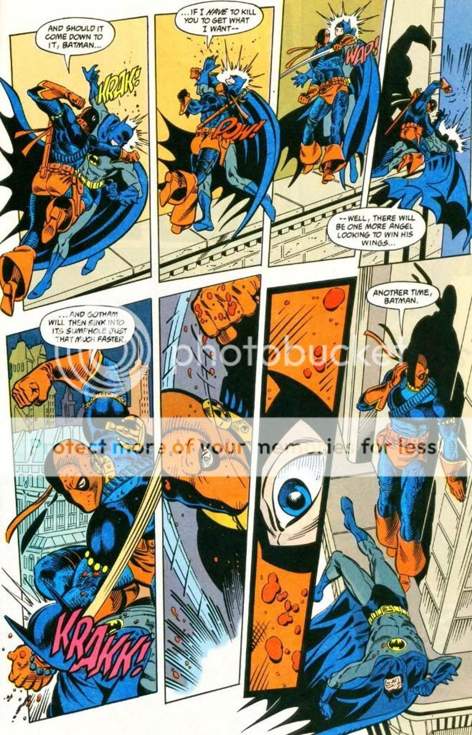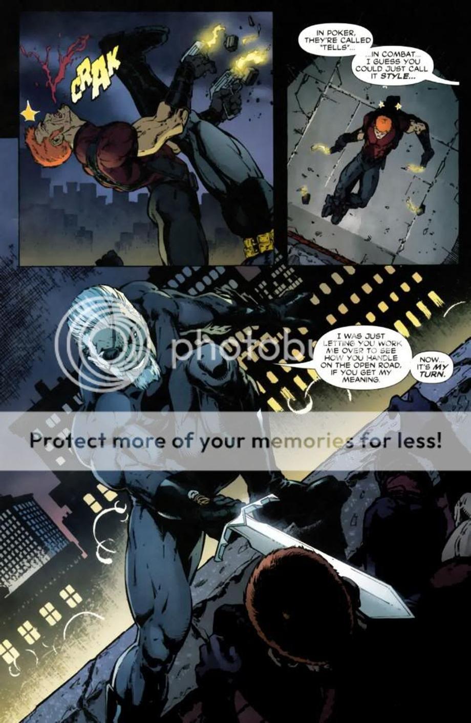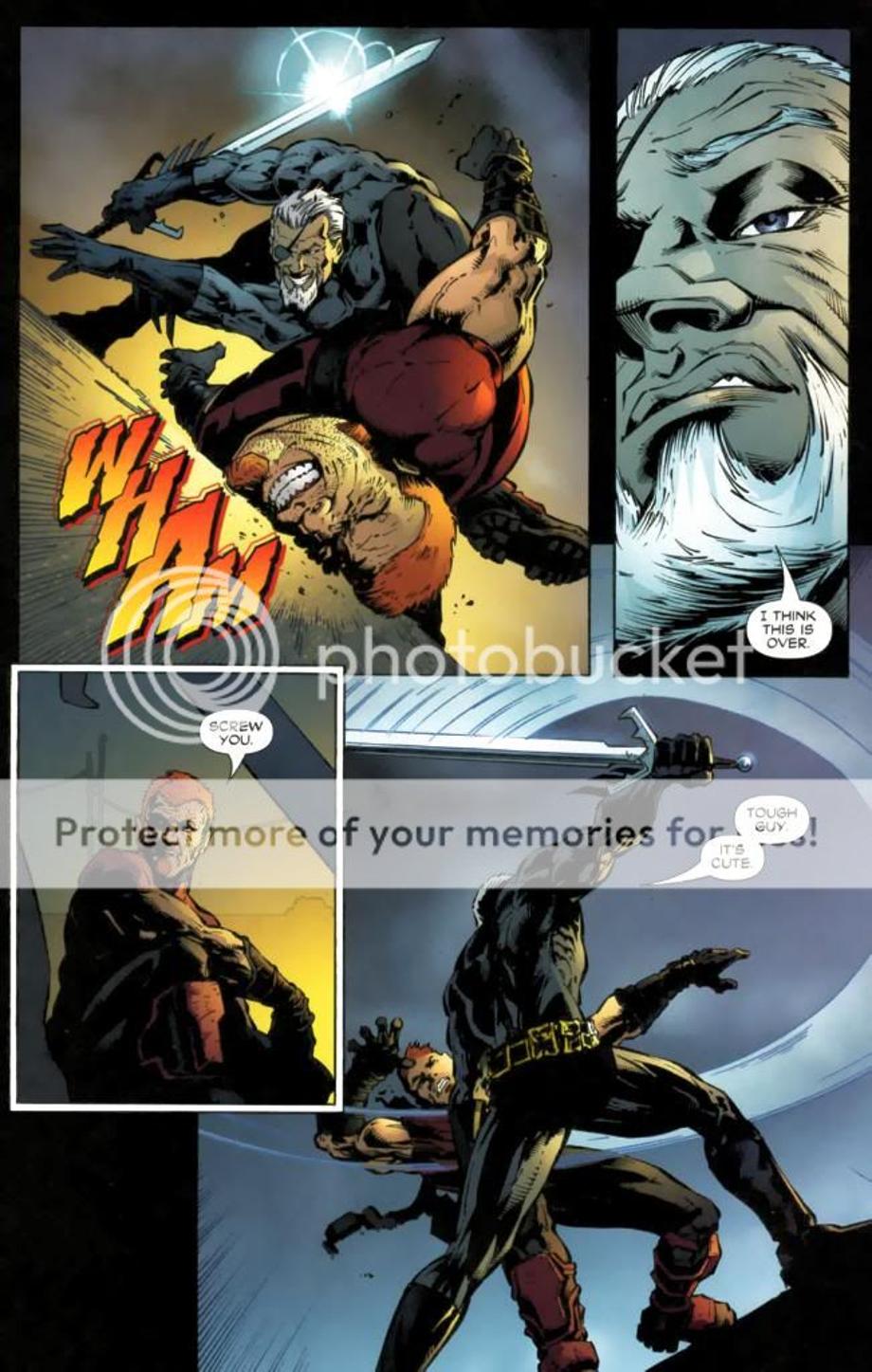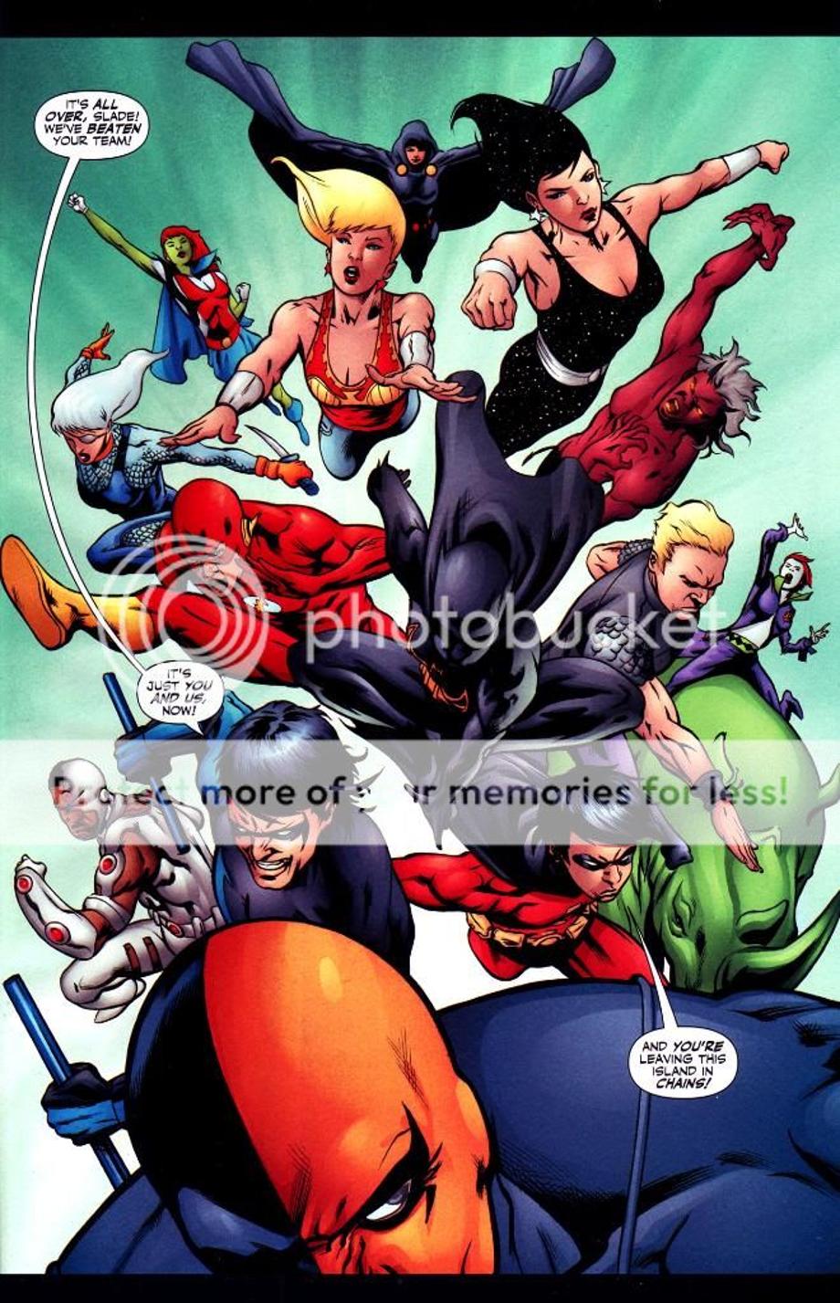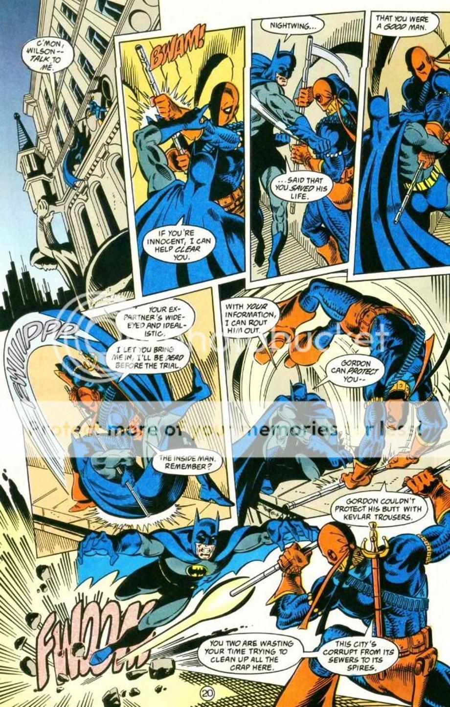 10. Nightwing is enraged over Slade killing his son, and Slade is suprisely lenient and tame.......still though, he easily takes all Nightwing's blows (letting him hit him), and floors him with a backhand. Then he makes sure he's alright.