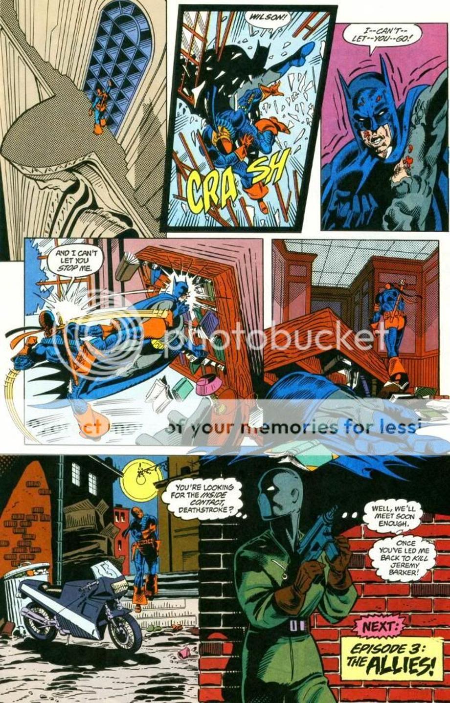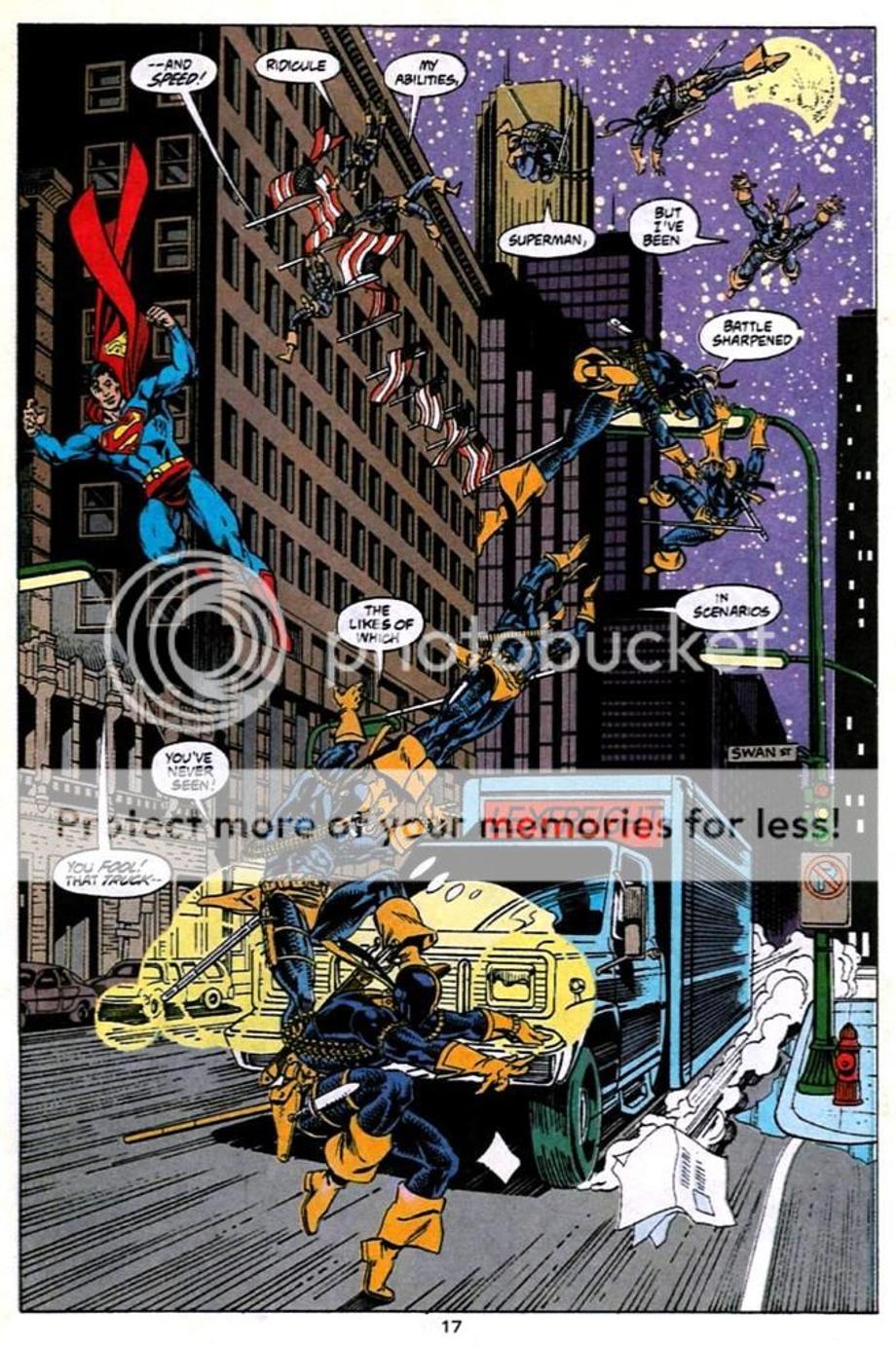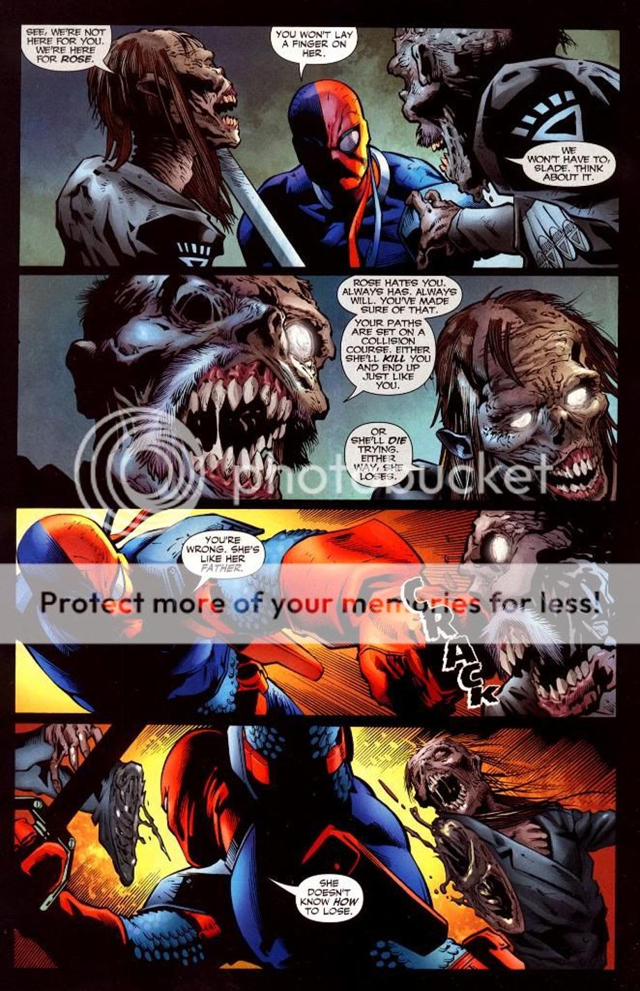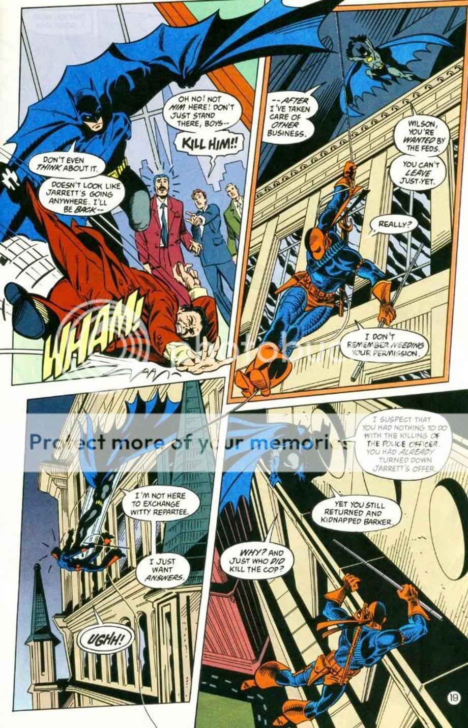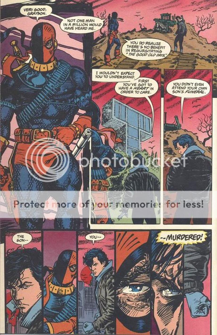 10. Nightwing is enraged over Slade killing his son, and Slade is suprisely lenient and tame.......still though, he easily takes all Nightwing's blows (letting him hit him), and floors him with a backhand. Then he makes sure he's alright.