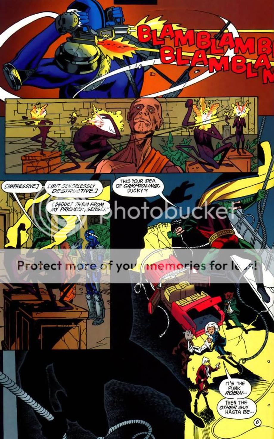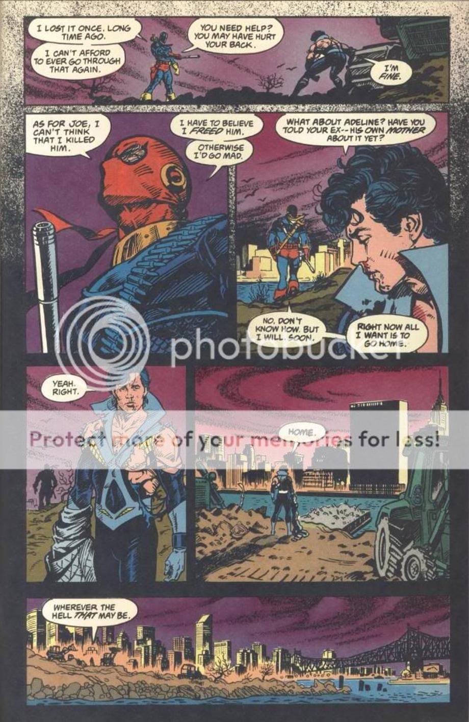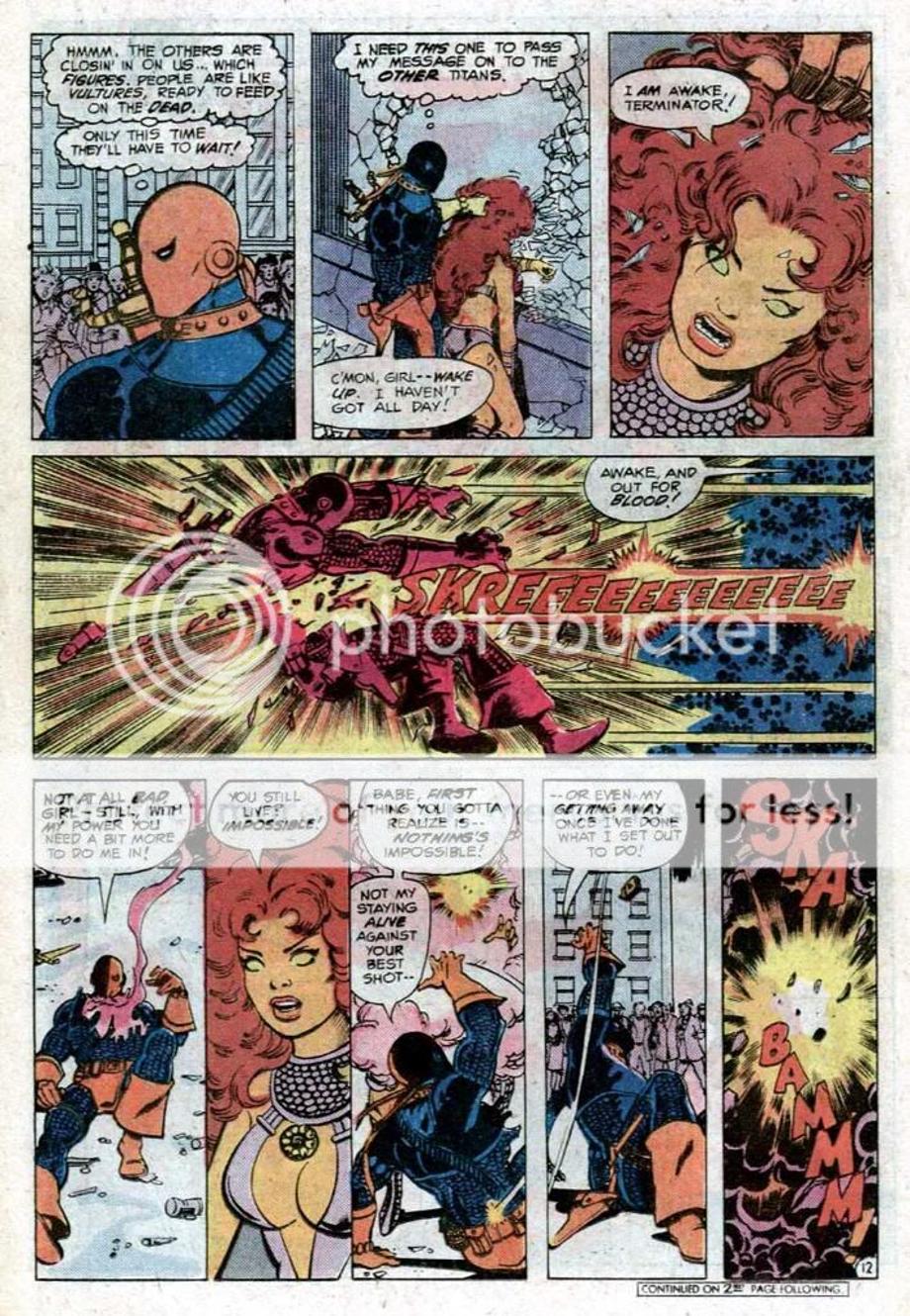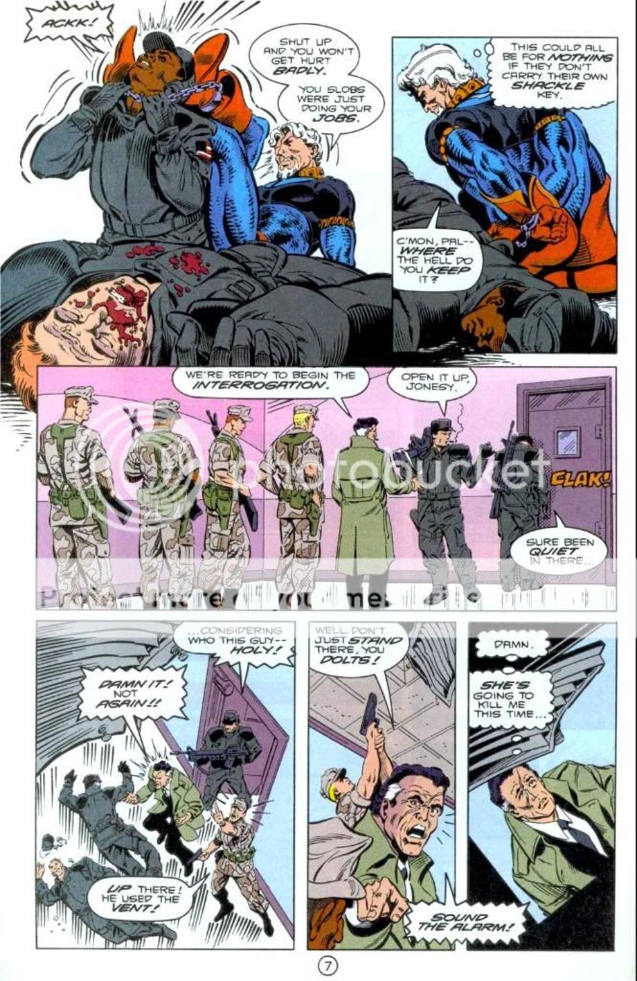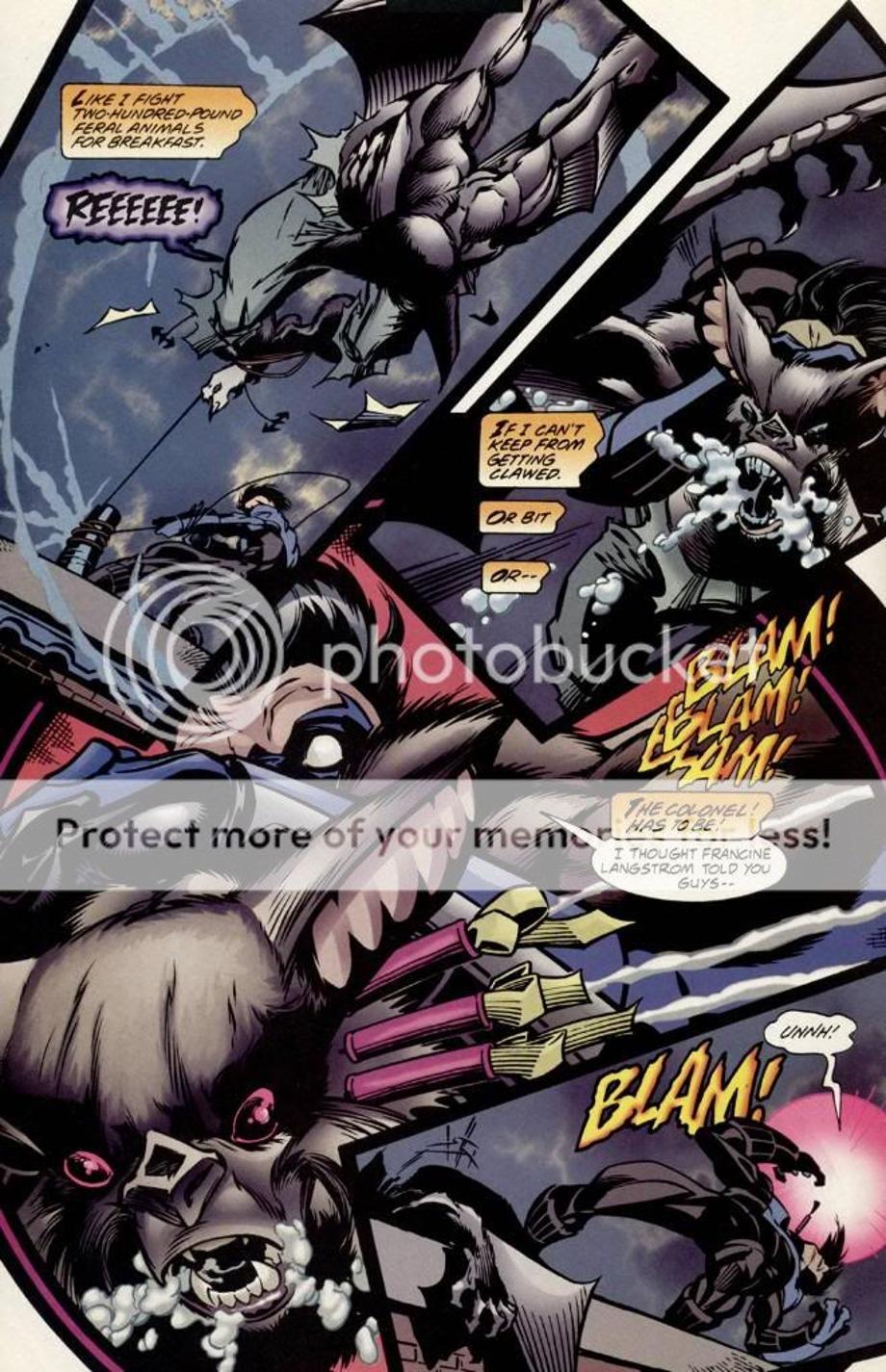 10. Nightwing is enraged over Slade killing his son, and Slade is suprisely lenient and tame.......still though, he easily takes all Nightwing's blows (letting him hit him), and floors him with a backhand. Then he makes sure he's alright.