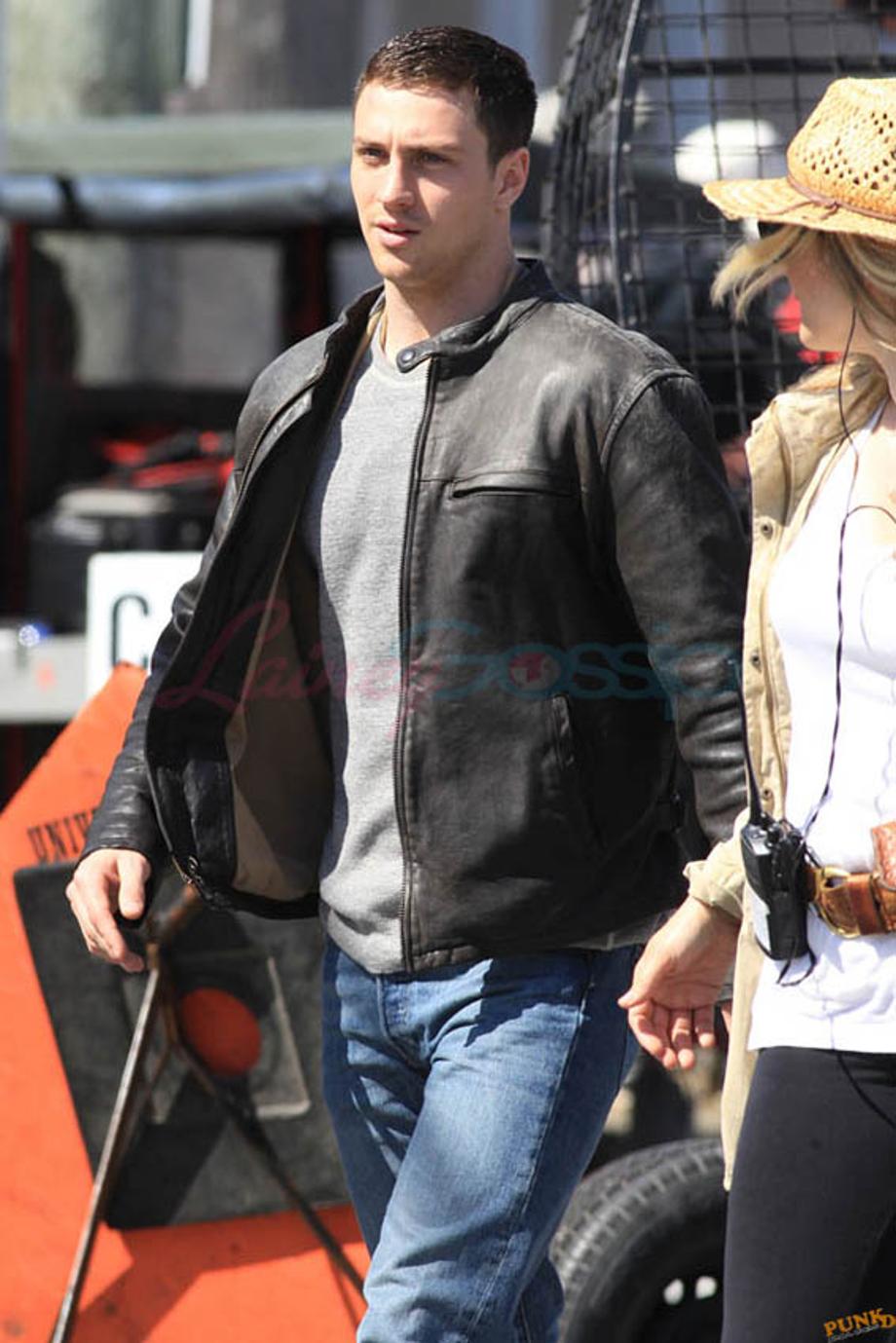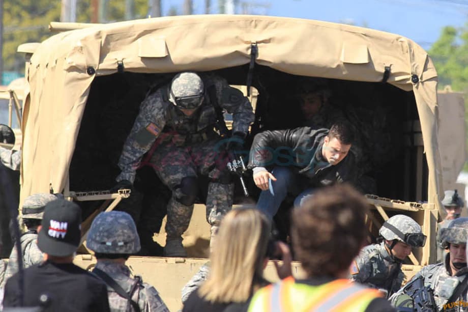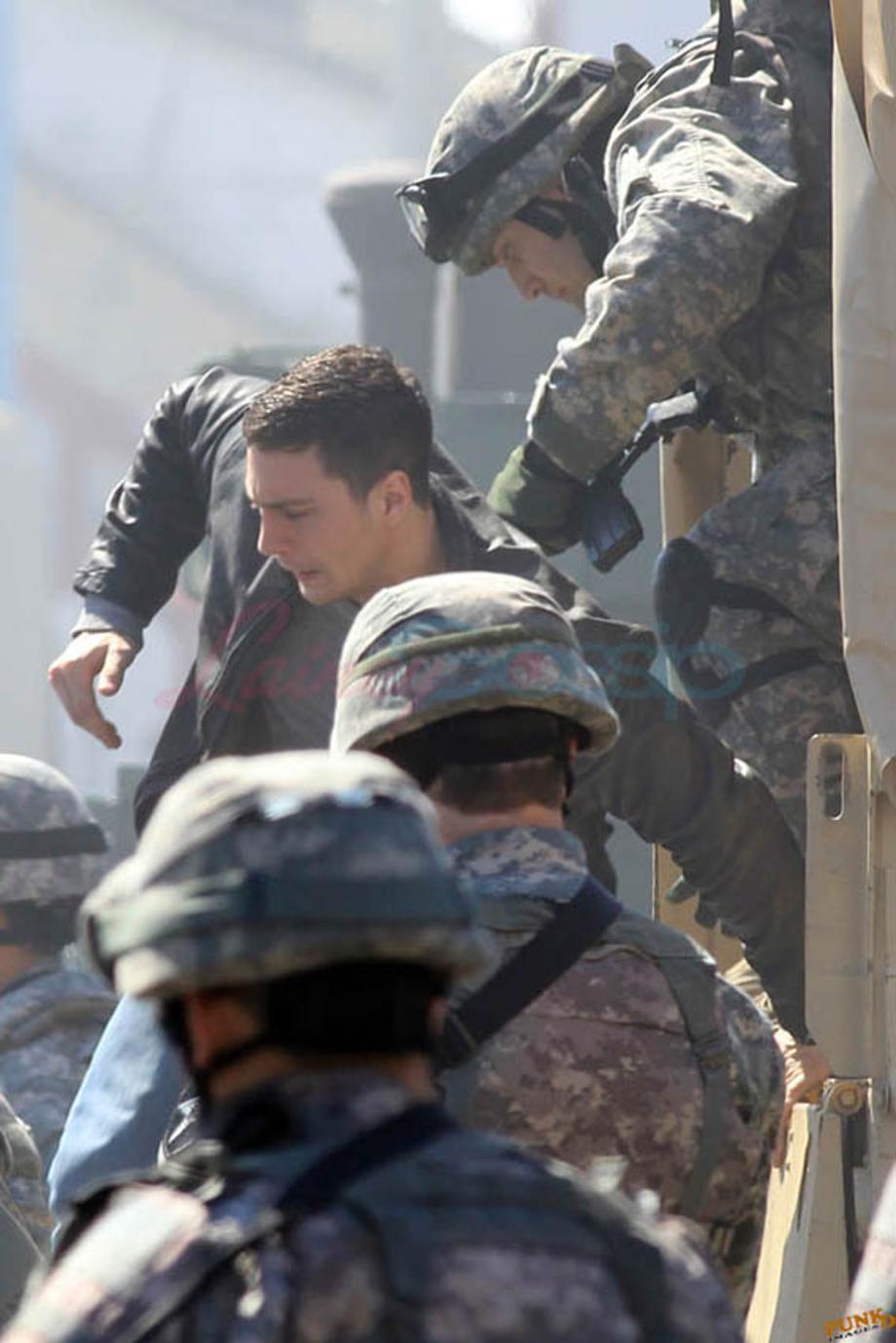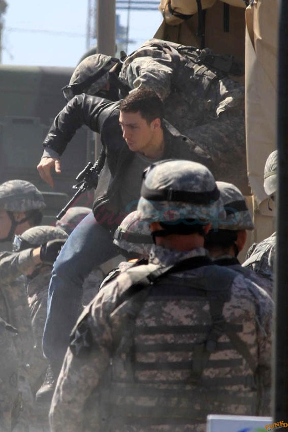 Actor, Aaron Taylor-Johnson ("Kick-Ass 2"), was spotted on the set of Godzilla. Not surprising, but what was interesting, was that Aaron was filming scenes in plain clothes, surrounded by extras dressed as soldiers. Hit the jump to check it out.