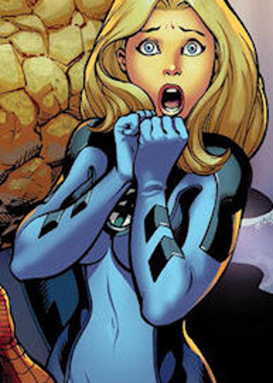 Sue wakes up facedown in a shallow pool of water, and in coming to this realization she inhales sharply and gasps in every last bit of air from the protective bubble formed around her face. Rolling over and coughing fluid then trying to stand up, she winds up staring down at her absent reflection in the water, past that she sees two submerged hands as they're steadily replaced by thousands of tiny air pockets covering a silhouette of invisible digits. So this is the afterlife, and I'm a ghost. Fantastic. Barely able to stand, she reels upward on two feet then looks down in absolute terror as her body vanishes in sequential anatomical layers, first to go is her blue Future Foundation uniform, then her skin and subcutaneous tissue, then her musculature, organs, ventral cavity and abdominal wall then finally her bones wither away from sight.
