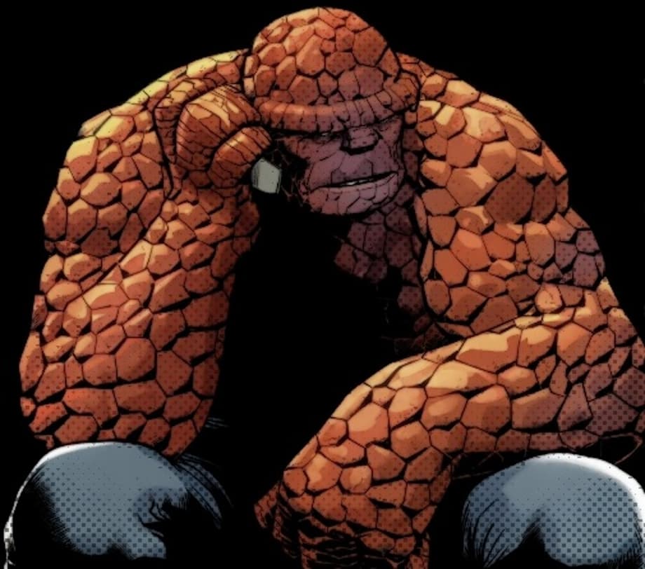 Ben Grimm - INERTIATIC MONOLITH: When the teleporter accident lifted four individuals out of their natural dimensional state, the fundamental nature of their cells began to cycle through a number of different possible evolutionary outcomes. Somewhere along the way, Ben's cosmically-irradiated epidermis became an abnormally dense yet flexible, interlocking network of orange, cobblestone-like rock patterns covering a geo-organic, metamorphic musculature that's 100 times stronger than the strongest human man. But this movie goes a step further and gives The Thing a new power, when Doctor Storm discovers there might be a metaphysical component to Ben's immunity to damage, an INERTIAL AMPLIFYER that makes Thing a living embodiment of Newton's 1st Law, you know, the one about bodies in motion and bodies at rest? Or to put it in comic book terms: when Ben is in motion he's Cain Marko, yet when he's standing still — he's Clark Kent, this explains why getting hit by a car doesn't knock him off balance even slightly, and when he clobbers back (with a running start) he can match the strength of The Hulk — this is what happens when an unstoppable force meets an immovable object.