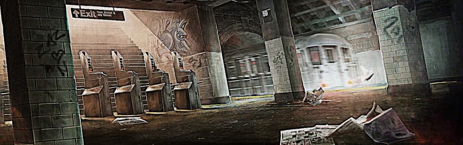 The other four reach an abandoned trolley station located directly beneath YANCY STREET which was under renovation when the attacks happened. It's remarkably well-lit as part of an urban renewal project to pump natural daylight into the subterranean space with a series of solar fiberoptic cables to photosynthesize the future site of an underground park. Ben says he recognizes the area from his days in the Yancy Street Gang, he and his brother used to host a Fight Club down here. Sue had no idea Ben used to be in a gang but says she can relate to having a delinquent brother, hers is a high school dropout with a few priors in grand theft auto. "No kiddin, for street racing?" "Ha! Try 'failure to return a rental vehicle' but I guess street racing sounds better." "Yeesh what a burnout, no pun intended." "Yeah ...no pun made?" Ben laughs for the first time in a long time. Harvey Elder says he sees potential in her brother and wouldn't mind taking in a new apprentice, is he interested in cryptozoology? Ben mocks that idea mercilessly, so Elder suggests they'll try and prove the existence of the fabled 'Boulder City Rock Monster.'" "Uhh, try the Golem." "Sorry? I'm not familiar." "Y'know it's an old Rabbi's tale of a big, dumb Thing made of clay, inanimate matter brought to life, made to perform tasks like a mindless slave. Sounds a lot like me." "That doesn't sound anything like you," Sue reassures him. "Well you know they kicked me outta Hebrew school, which don't exactly make you feel like one'a the chosen people."