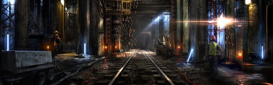 The armored truck backs up into a steel-reinforced tent covering the subway kiosk to let the team out covertly, Johnny races ahead and hops the turnstile while the rest casually descend the staircase to the 42nd STREET TERMINAL, "The busiest metro station in New York. I've never seen it this empty before." Reed leads the way, H.R. Elder is the last to reach the platform, slowed by the heavily padded green impact suit he's wearing, not to mention an insect-repellant cloak and night-vision goggle headset. His weapon of choice is what he calls an Ultra-Diode Rodule which doubles as a walking staff and essentially gives him the sillhouette of a steampunk wizard. The professor pushes past the mechanical gate and instructs the Human Torch to stay behind as their last line of defense, should anything go beyond this point, go supernova. The rest climb down into the trench and begin walking the length of the track, Johnny Storm waits for them to be out of sight before opening up his bag, pulling out an airline respirator mask recently 'borrowed' from Swanson's Garage, and then fire-glides across the trench landing on the two feet of ledge on the other side of the tracks. He unzips the bag all the way and, using the particular set of skills he acquired during his short stint as an autobody graphic artist, begins painting a giant mural to preempitvely let the subway-goers know which superhero team saved New York when the space-bugs attacked. Meanwhile, the remainder of this subsurface battalion patrols the tunnels directly underneath Lower East Side and waits for the next BLACKOUT, the tunnel lights dim and three gun-mounted flashlights switch on, yet the Tesla coil at the top of Elder's hi-tech walking staff burns brighter than any other light source.