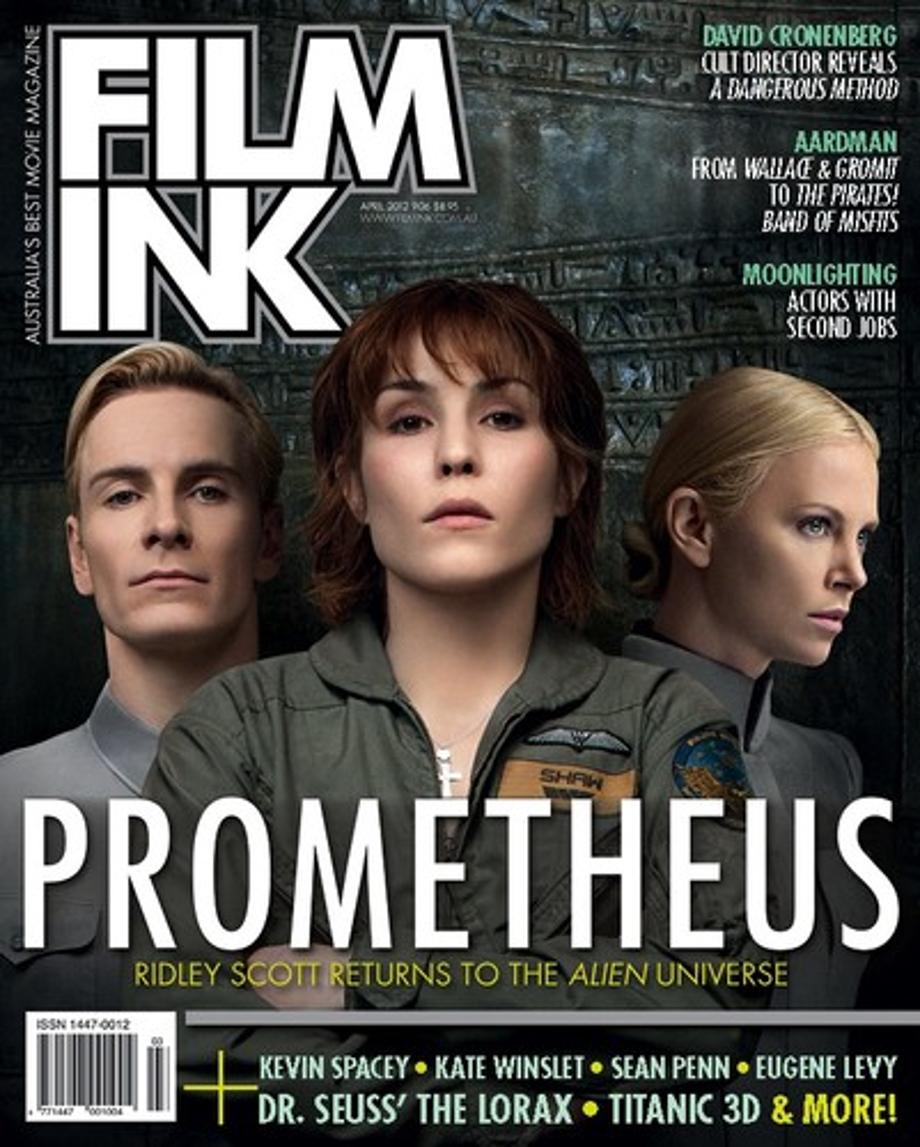 FILMINK, featuring Michael Fassbender (David), Noomi Rapace (Elizabeth Shaw) and Charlize Theron (Meredith Vickers):