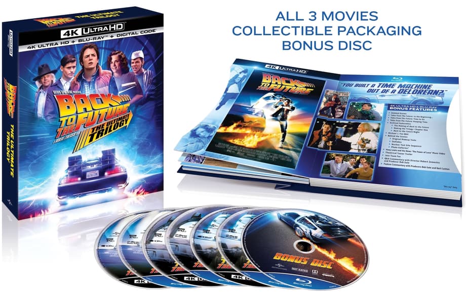 BACK TO THE FUTURE: THE ULTIMATE TRILOGY will include all three movies in collectible discbook packaging plus a bonus disc including all-new bonus content. For the first time, the past, present and future collide in eye-popping Ultra HD resolution for a time-traveling celebration. New 4K Ultra HD and Blu-ray™ deliver the highest quality picture, more colors than ever before, and immersive, multi-dimensional sound. From filmmakers Steven Spielberg, Robert Zemeckis and Bob Gale, this unforgettable 35th anniversary collection features hours of bonus features and is an unrivaled trilogy that stands the test of time making this a must-own for everyone’s movie library. All three BACK TO THE FUTURE films will also be available on 4K Ultra HD digitally for the first time ever and BACK TO THE FUTURE: THE COMPLETE TRILOGY will also be available on DVD.