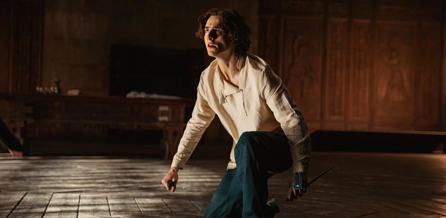 Here, we get a new look at Paul Atreides (Timothée Chalamet) gripping his Crysknife (a blade was made from the tooth of a dead sandworm of Arrakis). Although the mag doesn't specify, this shot is likely taken from an early training sequence involving Paul's weapons master Gurney Halleck (Josh Brolin).