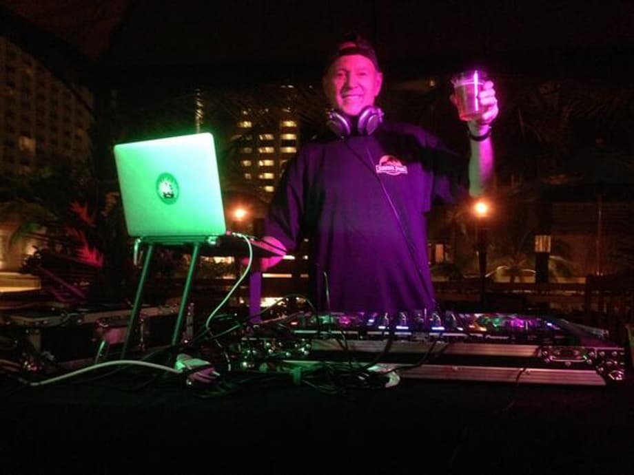 Cheers! DJ Master Frank kicks off #JurassicWorld start of photog party at Buffett's at the Beachcomber, Honolulu.