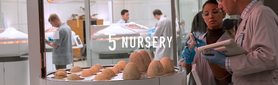The dinosaur DNA is inserted into eggs that allow a baby dinosaur to quickly grow to maturity. The eggs are monitored and kept at conditions that simulate their mother’s nest until they’re ready for the nursery.