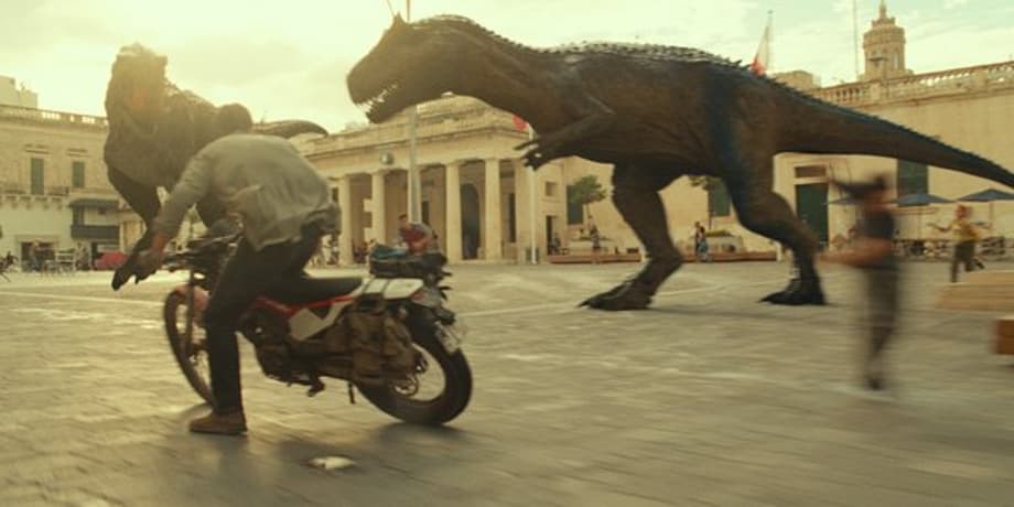 In terms of action, Dominion is an absolute blast. The motorcycle chase sequence with the Atrociraptors and other dinosaurs running amok in the streets of Malta is a complete show-stopper, while the Pyroraptor on ice sequence is its own kind of thrill ride. There are cool scenes with the Therizinosaurus, Deinonychus, and more too, but some are too spoiler-y to talk about. Then, the tense pre-finale sequence with the Giganotosaurus will have you on the edge of your seat, setting the stage for the franchise's biggest finale yet, which delivers just like a big summer blockbuster should, giving us the dinosaur-on-dinosaur action we have all been waiting for.