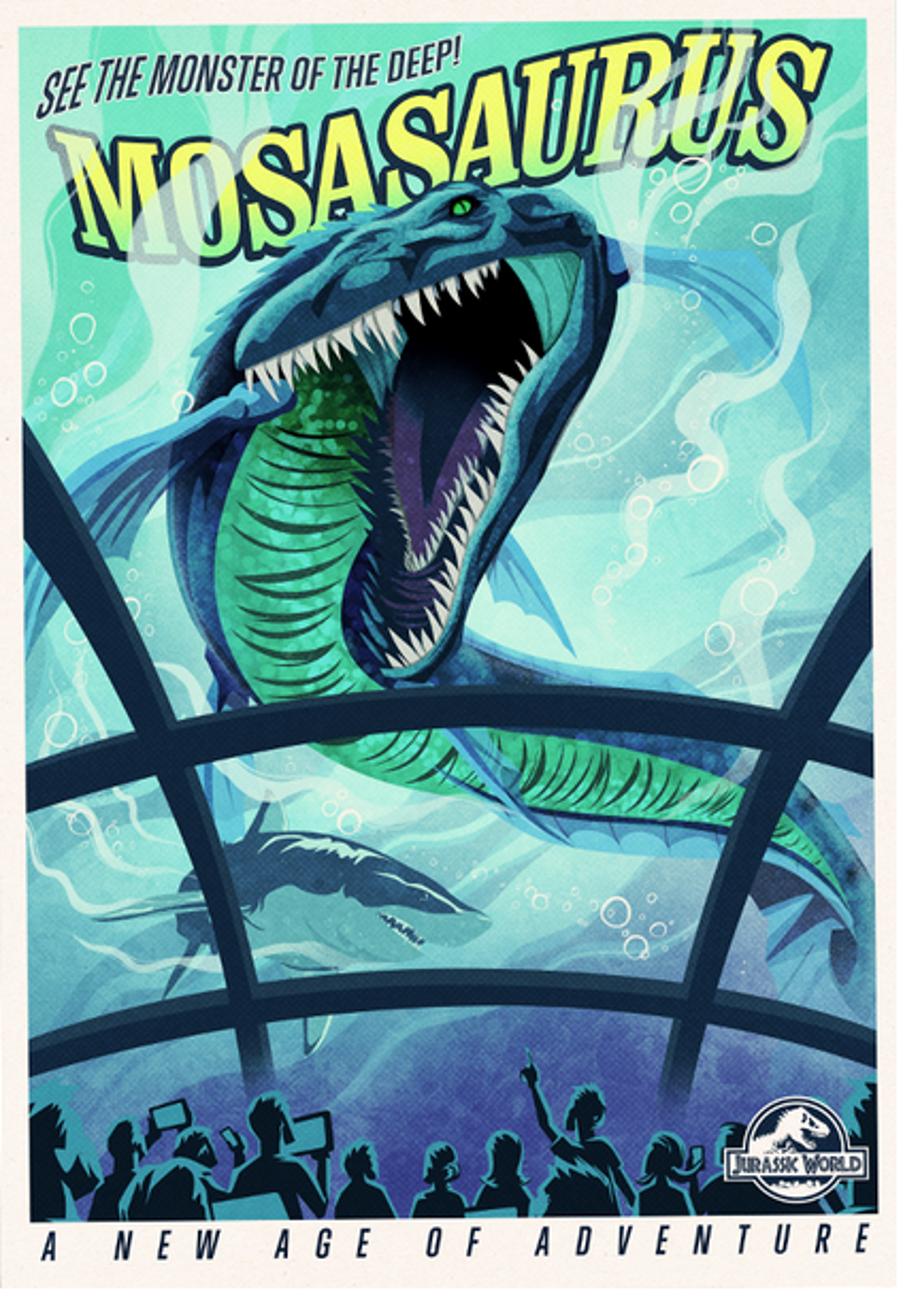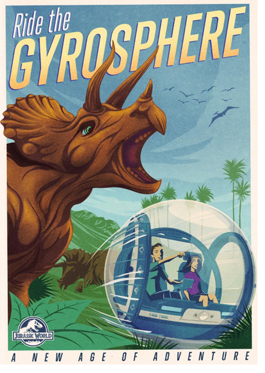 Thanks to the Raptor Pass, Universal Pictures has just sent out four new awesome “travel-style” Jurassic World posters! The first two highlight the “safe” Gyrospheres (and a triceratops), as well as the film’s hero, the Mosasaurus! The final two posters feature the park’s most menacing dinosaurs, the Indominus Rex, and Tyrannosaurus Rex.