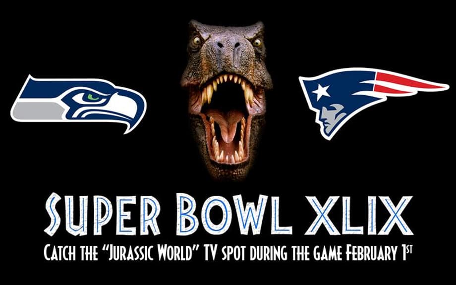 A promotional image for the Super Bowl XLIX game between the New England Patriots and the Seattle Seahawks on February 1st features a new look at a very angry T-Rex from Colin Trevorrow's Jurassic World. Plus, we also have some footage from the upcoming Jurassic Park arcade game.