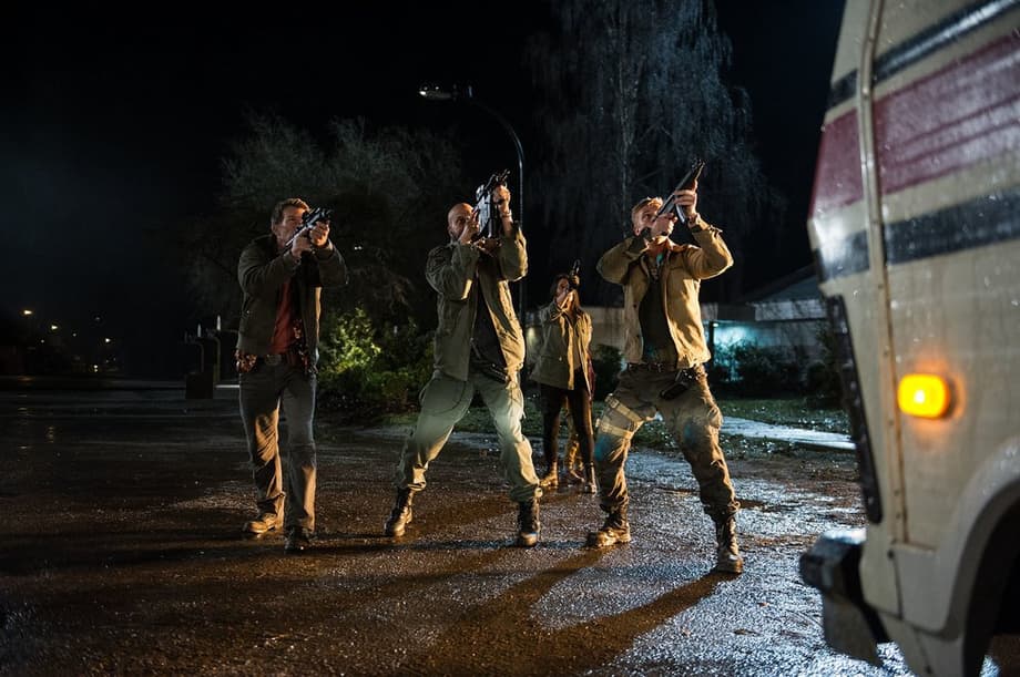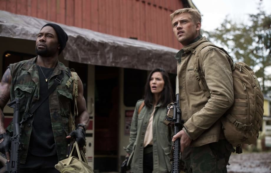 Some of the movie's protagonists, including Boyd Holbrook, Keegan Michael Key and Olivia Munn, stand with weapons at the ready.