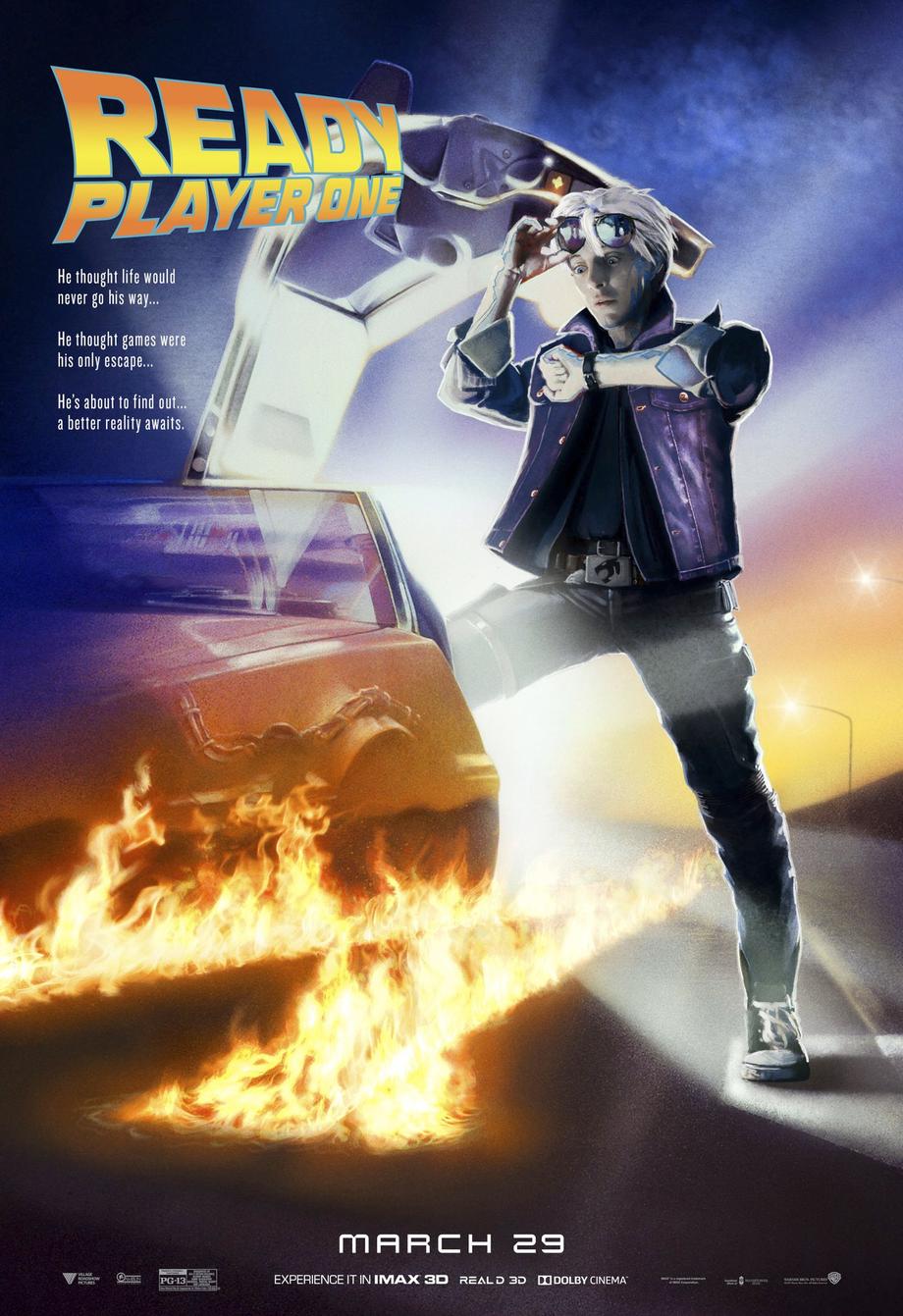 Here's arguably the best poster of the bunch as we see Parzival (Tye Sheridan) borrow Tom Cruise's shades as he officially enters his name into the competition that could change his reality forever. Art3mis (Olivia Cooke) also features, taking on Rebecca De Mornay's role atop Wade's DeLorean.