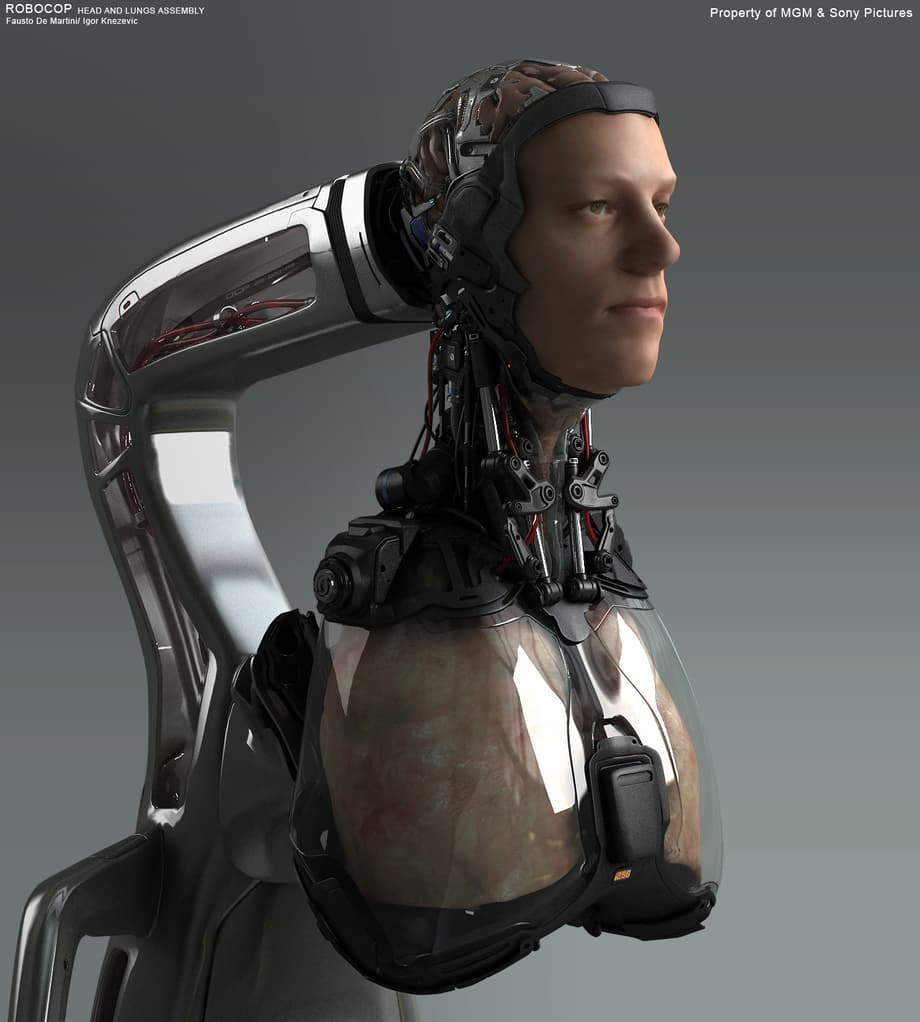 Fausto De Martini: The fact I do my design in 3D helped the transition to the print phase. After I was able to flesh out most of the design, I was asked to start matching the suit to the "Body Stunt" actor. It was interesting that it didn't require much push and pull since the suit had a realistic proportion from the get-go. The only part that was challenging was the waist and joints, which were made to feel very skinny to indicate RoboCop had completely raw mechanics in those areas. They ended up replacing those parts with CG to keep RoboCop true to the concepts. After I modified the suit to the stunt actor and got all the designs approved I passed the geometry onto Legacy. They did an amazing job using the design I did to build the final suit.