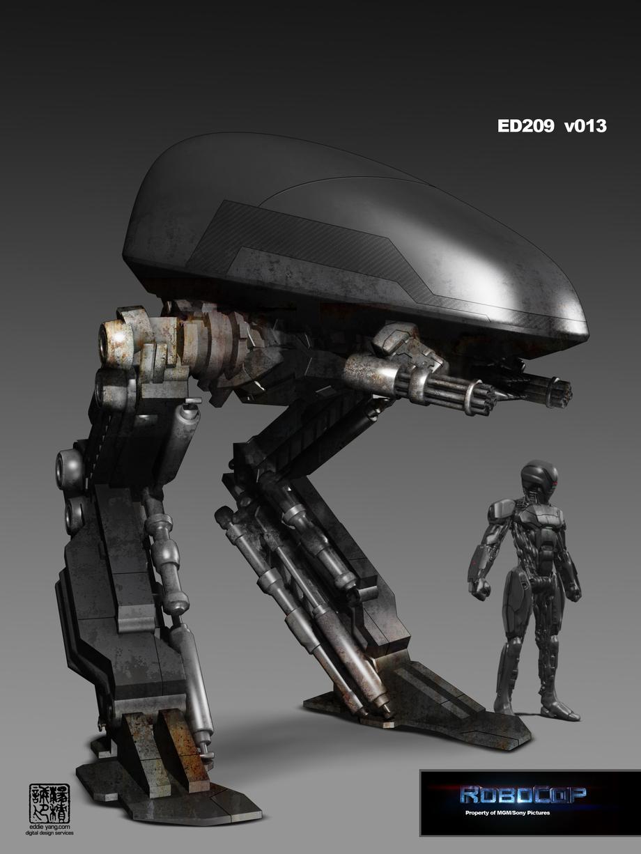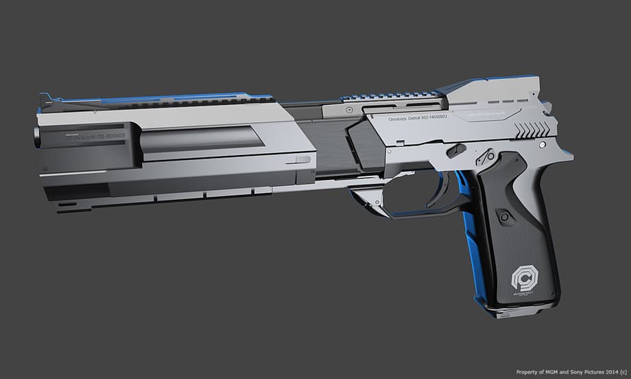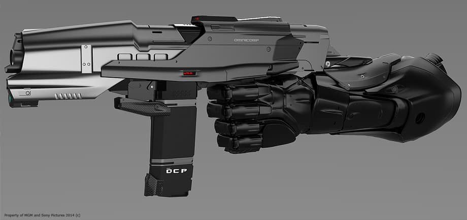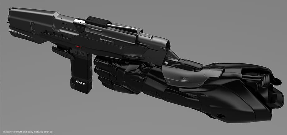 Vitaly Bulgarov: In the film Robocop is equipped with a Taser gun and a heavy caliber sub-machine gun with the buttstock mounted on the forearm for extra stability. I had a chance to work on both early versions and the final designs of the weapons. One of the idea that was also fun to explore was the Robocop’s arm transformed in-to machine gun. (click here for more images)