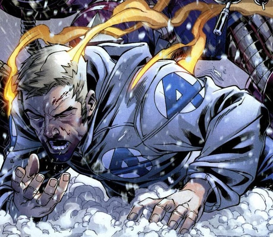 The hovering contraption dashes out a pre-broken window to no avail of discouraging its fiery pursuer, who lands on top of it and begins flame-punching its outer hull before he has to be flung off by a strategic barrell roll. Richards now braves the snowstorm alone, on-foot at ground level, trudging towards the impact point of the human meteorite then fishing him out of the snowbank. Now with the blizzard clearing up, a higher visibility range has opened up new facets of their environment, which now appears to be much more than just a cosmic junkyard... "An ice planet with flying robots and stone ruins. Explain that one, genius." "The remnants of a lost alien culture? Hold on a minute, these engravings look like..." His hand brushes clumps of snow from the impressions on a stone block. "Cyrillic?" "But that means... Reed, if you tell me we've been on Earth this whole time, I swear I'm gonna..." If the look on his face doesn't confirm this to be the case, the nervous laughter does. "Ahaha, woops? I must've miscalculated our—" Johnny Storm takes to the air, flying up through the ruins as we pan back to a wide shot, revealing an entire STONEHENGE of human achievement amidst the winter scrapyard. To punctuate the scene, the back of Torch's head, shaking in disbelief, occupies the foreground of the frame with the gothic spires of a MEDEIVAL FORTRESS looming in the background. "Oh you've gotta be shitting me."