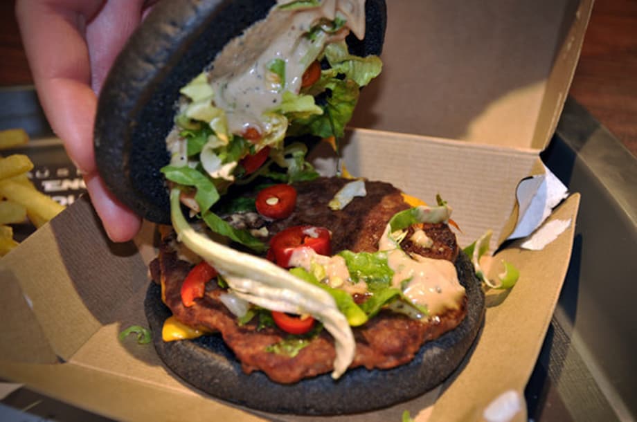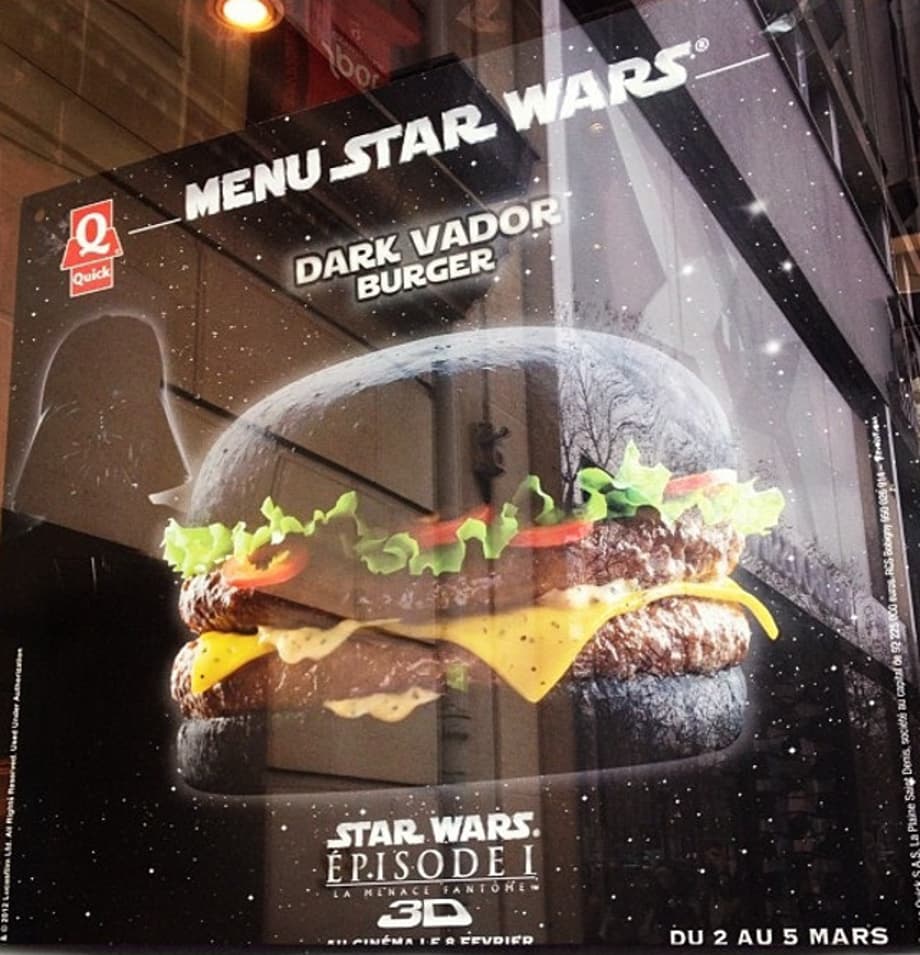 Here are some shots of the European fast-food Quicks chain's black-bunned Darth Vader burger. As you can see, it doesn't look like complete shit, unlike the ones served at Mcdonalds. You show me someone at BK who can assemble a burger that looks even remotely like what it's supposed to and I'll show you an alternat f***ing reality. That said, I'm sure most of you here would probably not be willing to choke this thing down. As I assume that y'all only like to eat-- "WIENEEEEERRS!".