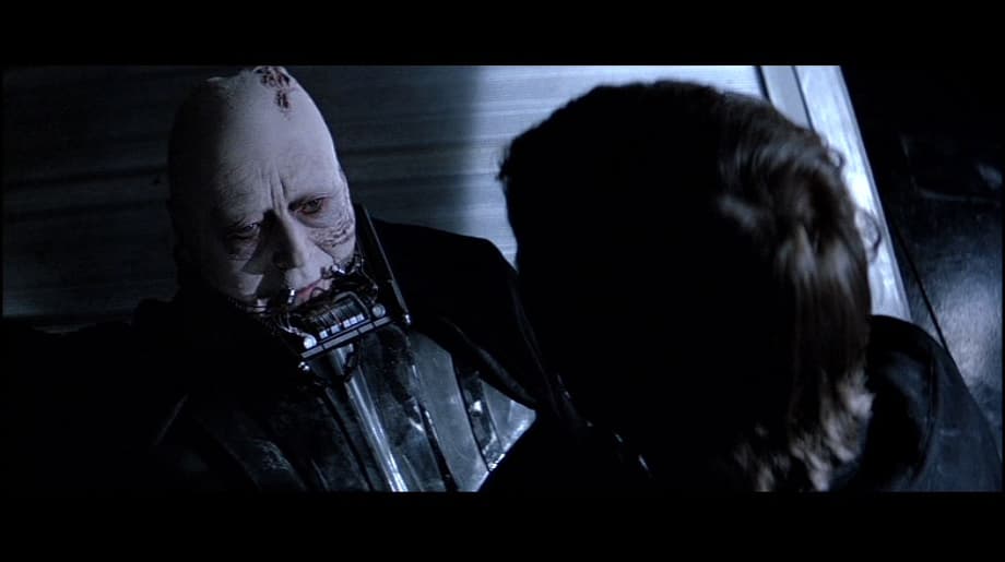 We get a shot of the construction of the Death Star as the newly suited Darth Vader walks across a Star Destroyer towards the Emperor.