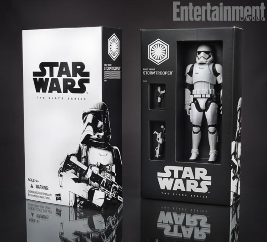 After some images leaked online, EW has now provided an official glimpse of the first wave of Star Wars: The Force Awakens merchandise. Check out the LEGO and Hasbro Black Series versions of the First Order Stormtrooper, and Mattel's Hot Wheels First Order Stormtrooper car...