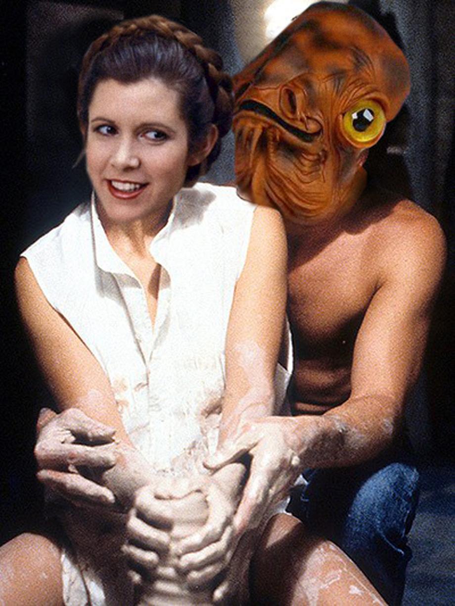 OK, bad puns and obligatory slave outfit picture aside,we have to remember thirty years have passed since ROJ, and we've been given very little in the way of facts for that block of time. We do know Luke started a new academy. We know Kylo burned that shit down. We know Snokey (only you can prevent Jedi) influenced him to do it via social media or something. We know Luke started listening to The Cure shortly after and never came out of his room again. But the other fact we know, and relates to my theory, is that Han and Leia broke up at some point. It just didn't work. He's a space cowboy and she's a space general. Opposites attract, but schedules can kill the mood. So, they split amicably and went back to doing what they do best. She continued rebuilding and running the galaxy and he went back to smuggling testicle monsters.