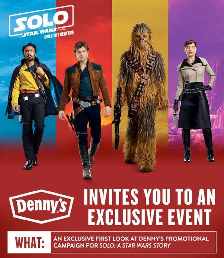 Denny's is getting ready to launch their promo campaign for Ron Howard's Solo: A Star Wars Story, and we have brand new looks at the titular scruffy lookin' nerf herder, along with Lando, Chewie and Qi'ra.