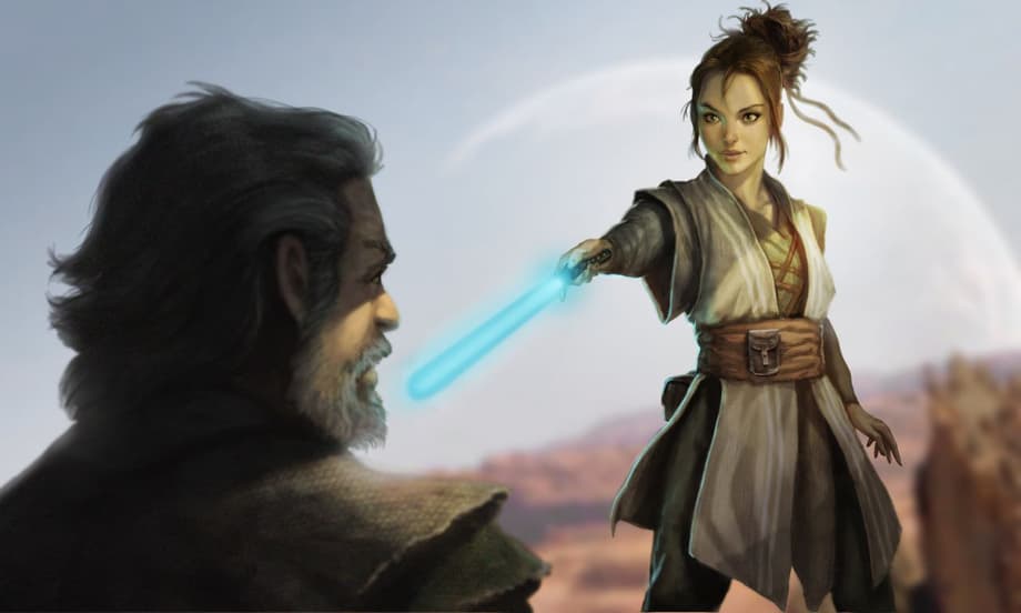 Rey demonstrates her skill with a lightsaber to Luke Skywalker in this more cartoonish interpretation of one of the early scenes on Ahch-To from artist Karl Lindberg.