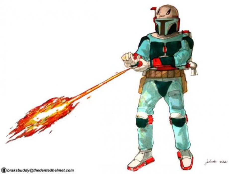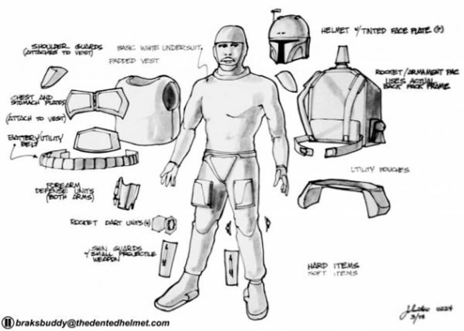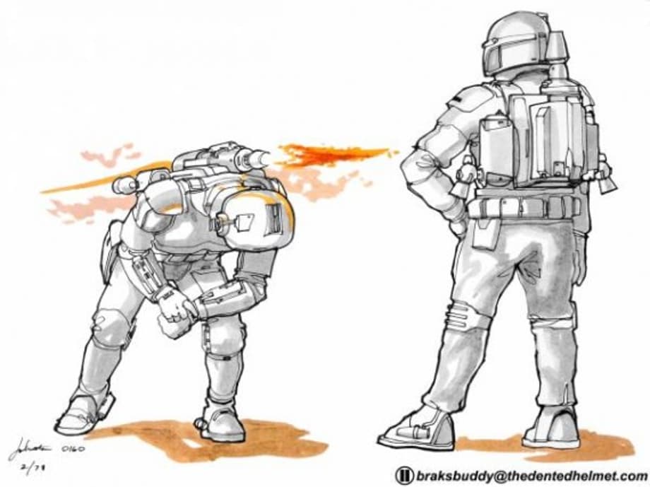 The website, thedentedhelmet.com, posted original concept art that Joe Johnston created for Boba Fett when he worked as a concept artist on George Lucas' Star Wars films. And yes, that is the same Joe Johnston that directed Honey, I Shrunk the Kids (1989), Jumanji (1995) and even Marvel's Captain America: The First Avenger (2011). When you look at these alternate white-armor designs you may not even recognize him as the character that hunted down Han Solo (Harrison Ford) in Star Wars Episode V: The Empire Strikes