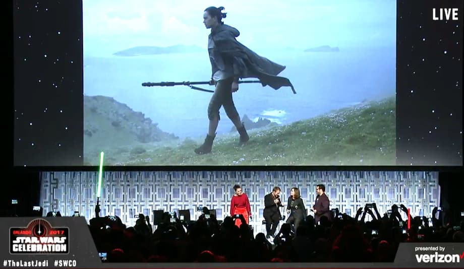 Director Rian Johnson, producer Kathleen Kennedy, and Daisy Ridley (Rey) are currently on stage for the panel at Star Wars Celebration Orlando, and before Ridley dropped an intriguing tease about her character's relationship with Luke Skywalker ("never meet your heroes, because they might not be what you expect"), a batch of new images were released.