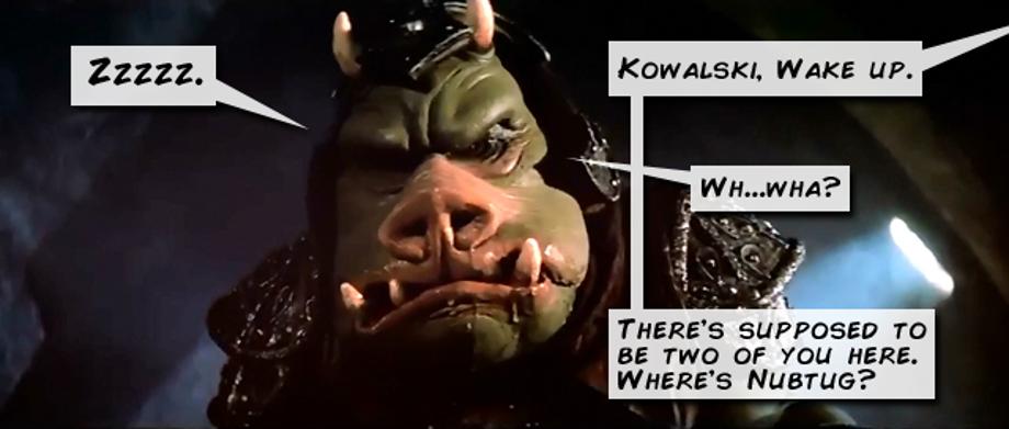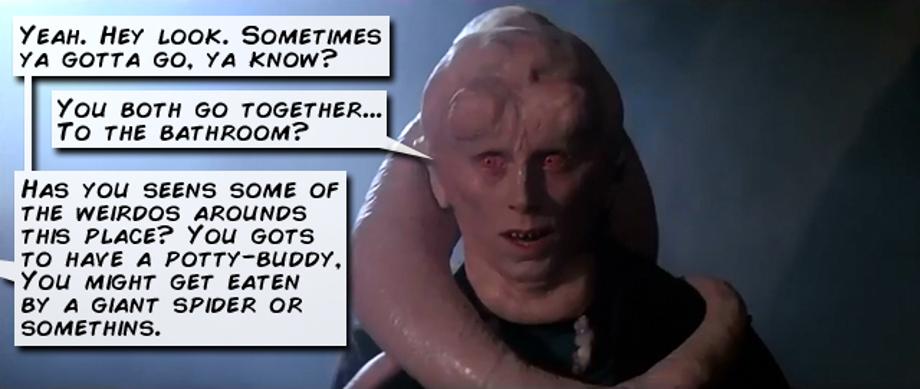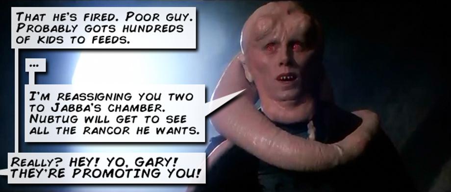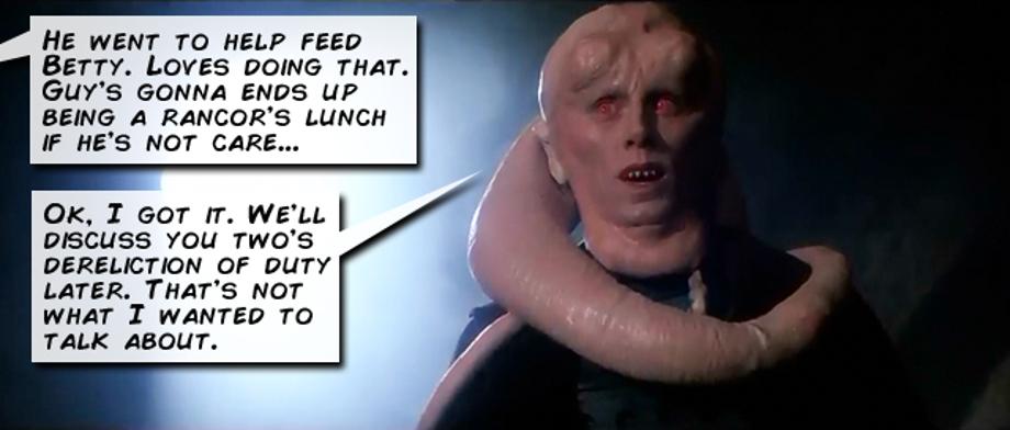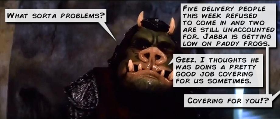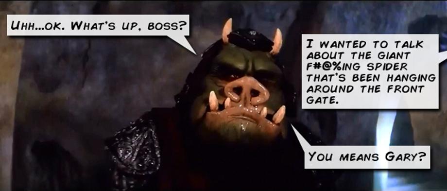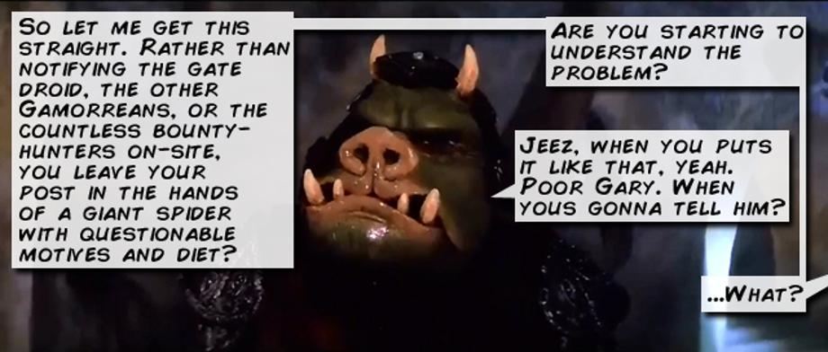 As a kid, I was like, “Ahhh! Giant spider!” But now as an adult and watching it with my kids, I was like, “Ahhh! Giant spider,” while they just looked at me like I was an Ugnaught. I never understood what it was doing there. It seemed to live in a hidey hole next to the entrance. What purpose did it serve? Was it just to remind visitors that this is indeed a scary place? It sure freaked out C-3PO. Jabba’s was a pretty sadistic guy, so I just assumed he had a “If you can make it past my giant spider, I might let you see me” policy.